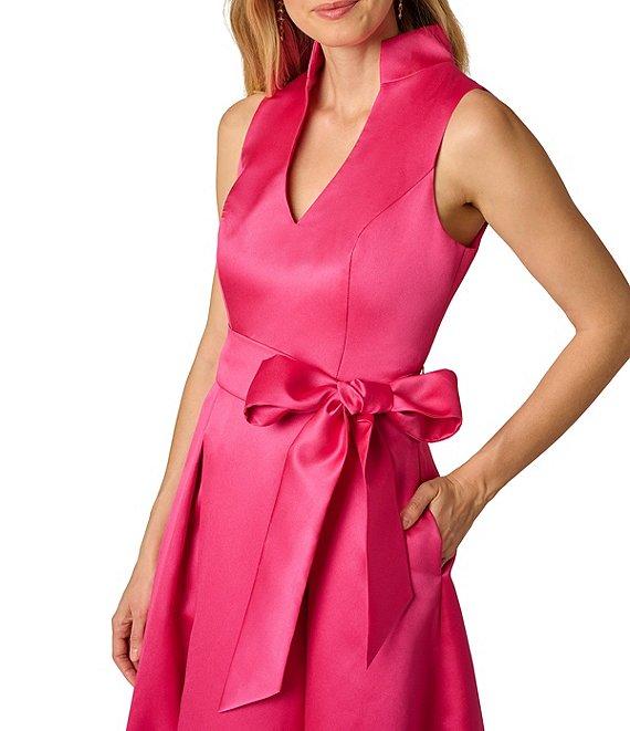 From Adrianna Papell Petite, this dress features: Taffeta mikado fabrication V neckline Sleeveless A-line Silhouette Lined Front tie detail Pleated skirt Back zipper closure Approx. 62" in length Polyester Dry clean Imported.
