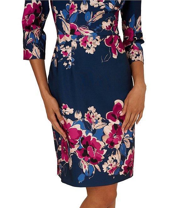 Adrianna Papell Twill Border Floral Square Neck 3/4 Sleeve Sheath Dress