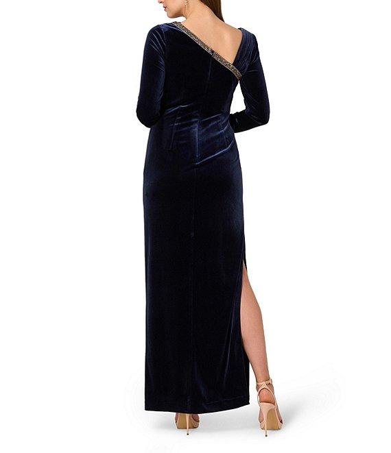 From Adrianna Papell, this dress features: Velvet fabrication Asymmetrical neckline Long sleeves Heat fix gem neckline Lined Side seam skirt slit Center back zipper closure Approx. 61" in length from high point shoulder Polyester/elastane Spot clean Imported.