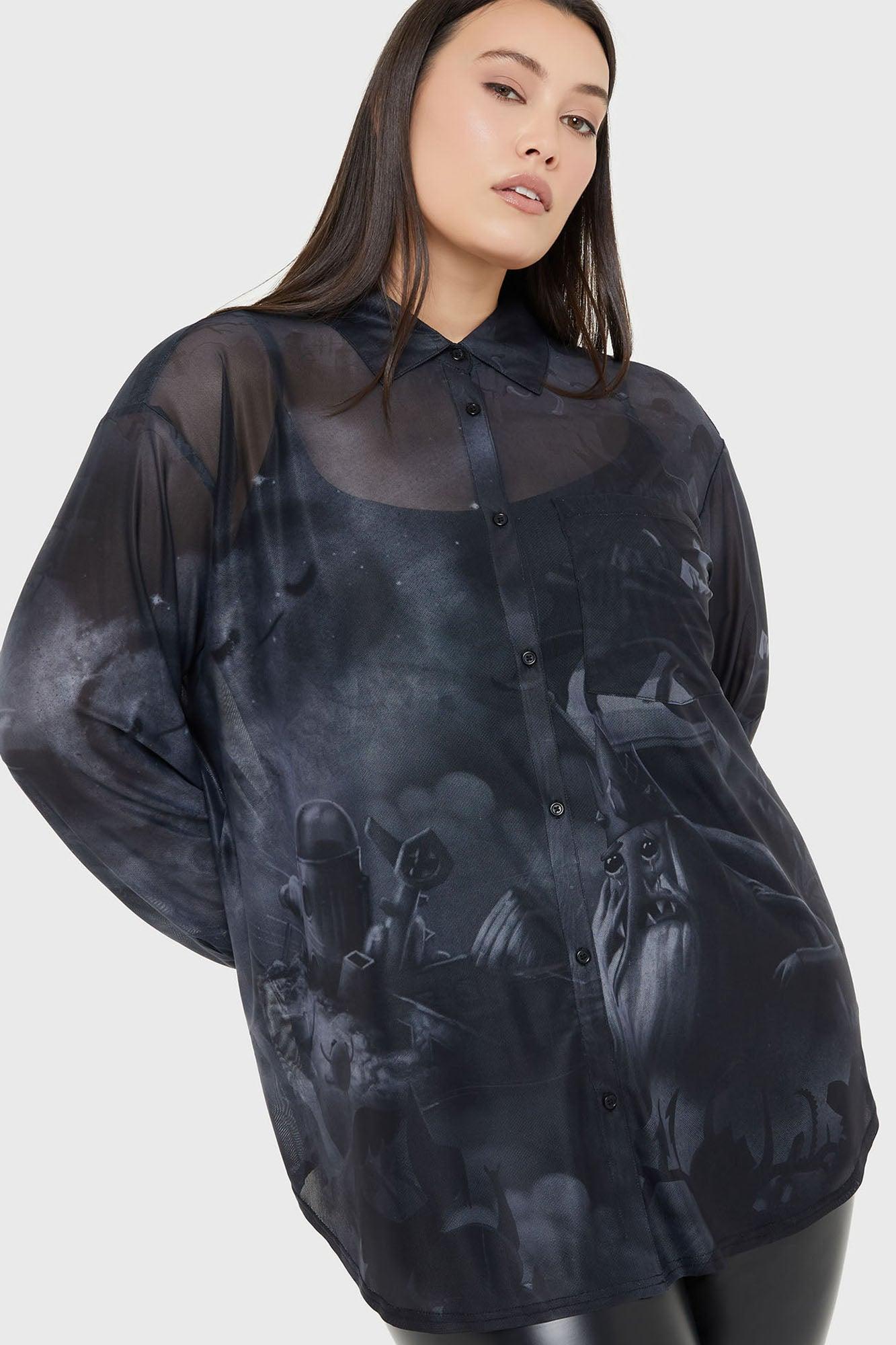 ADVENTURE TIME- Official ADVENTURE TIME licensed product.- Soft feel, high-quality sheer stretch mesh fabric. - Long-sleeved with buttoned cuff fastening.- Front button closure.- Unique all over 'Adventure Time' graphics.- Designed in Brighton, England.Model is 5'9 and wears a size XS.With KILLSTAR branding, 49% viscose 32% polyester 19% polyamide.Machine wash cold (30°c) / Do not bleach / Do not tumble dry / Iron at low temperature / Do not dry clean. Imported.