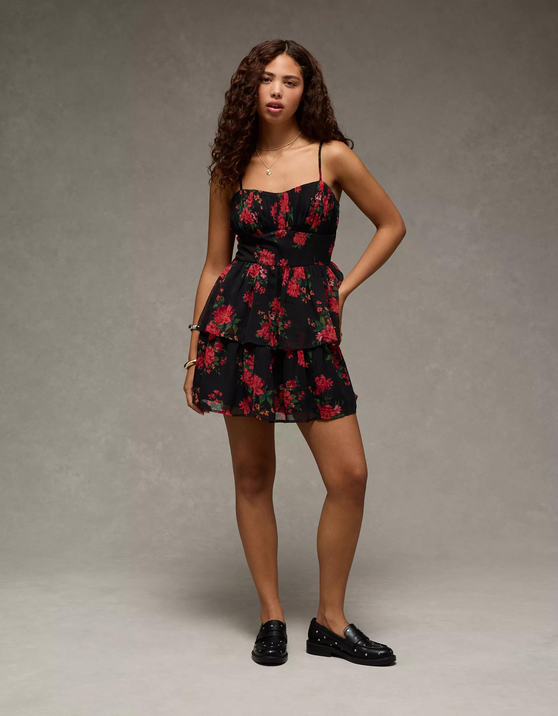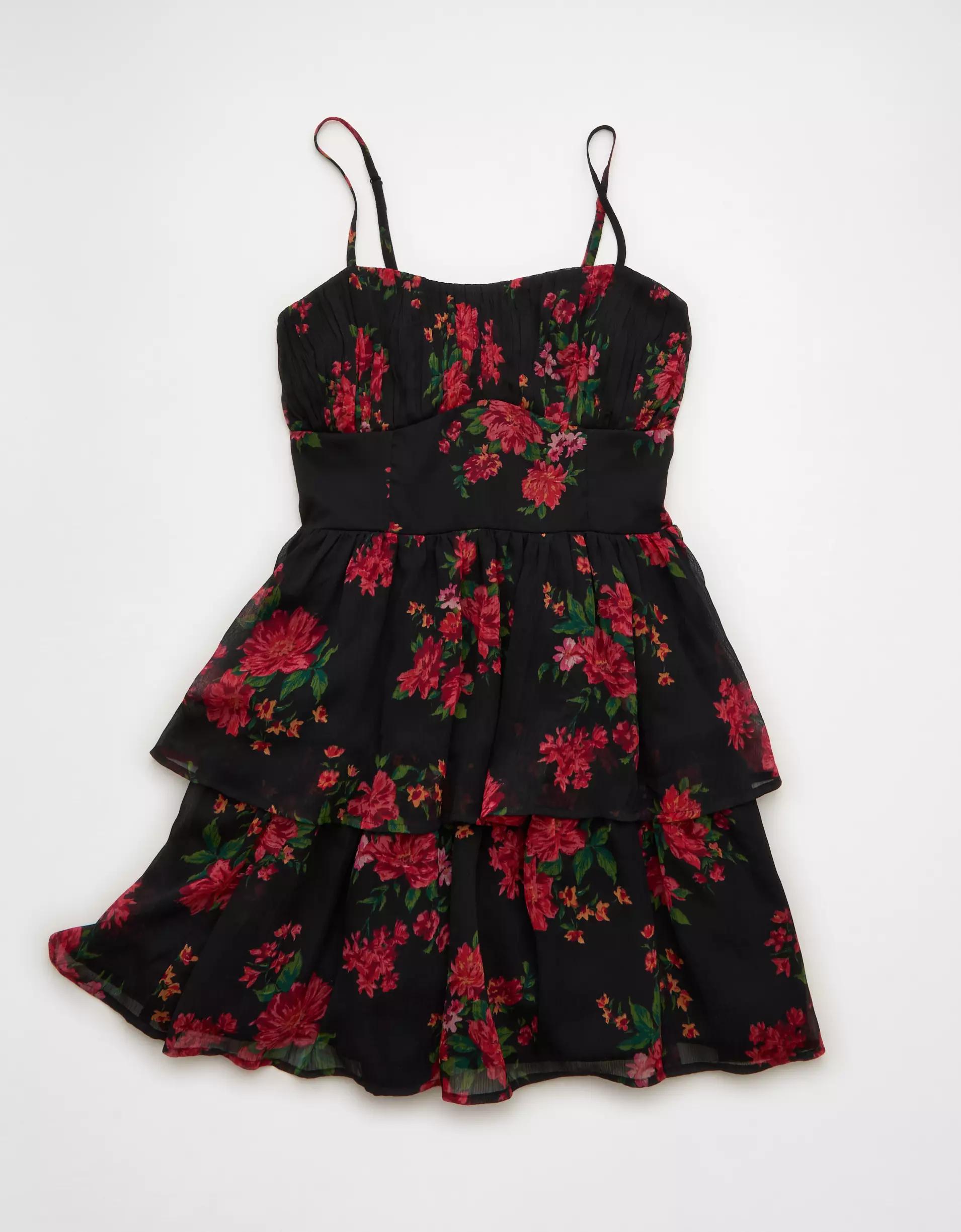 Features a tiered corset top and ruched bust, great for a night out with friends or romantic date!