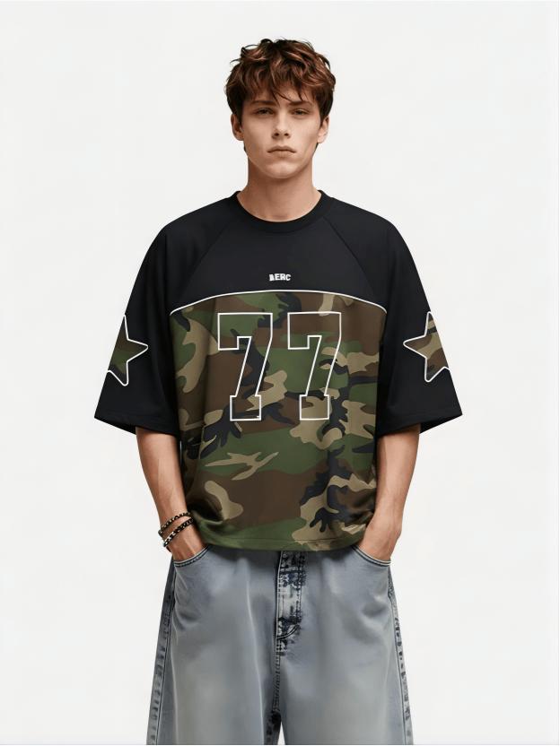 This statement tee fuses classic military camo with streetwear flair, featuring a unique patchwork layout of green, black, and grey panels across the sleeves and sides. It offers comfort without sacrificing style — perfect for pairing with cargos, denim, or your go-to sneakers. Material: 100% Polyester. Clothing details: Number Embroidery, Patchwork. SIZE GUIDE