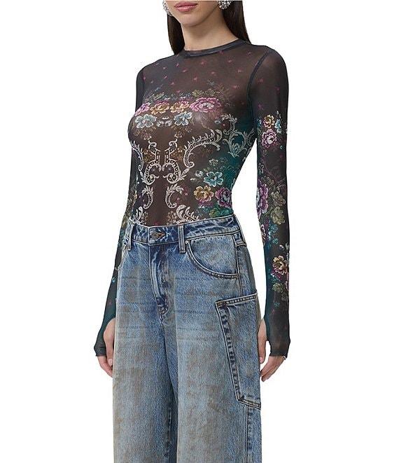 AFRM Kaylee Baroque Floral Print Crew Neck Long Sleeve Mesh Top