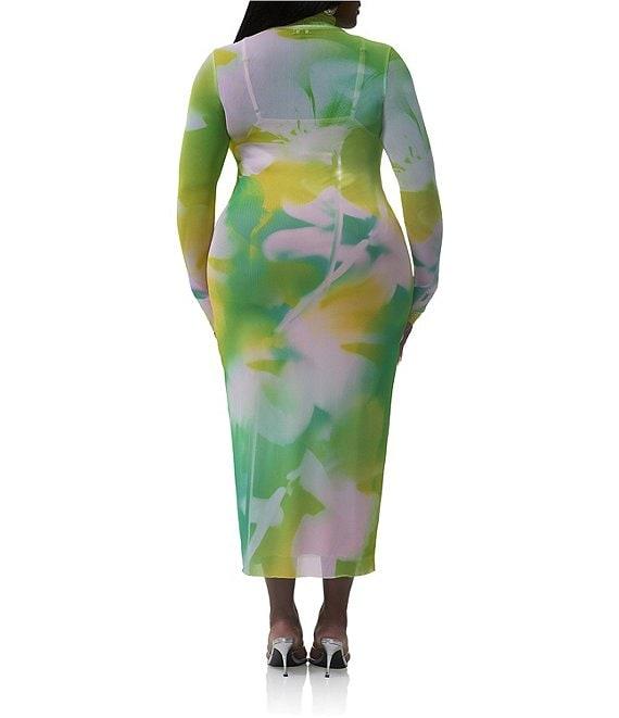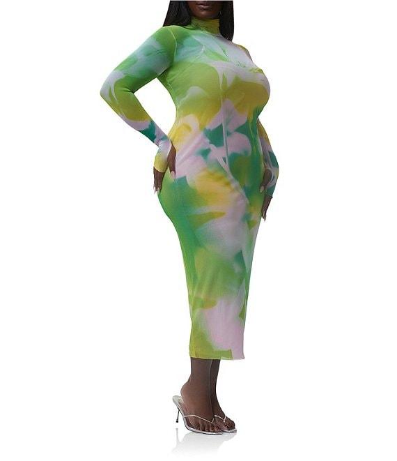 AFRM Plus Size Shailene Watercolor Print Mesh Turtleneck Long Sleeve Midi Dress