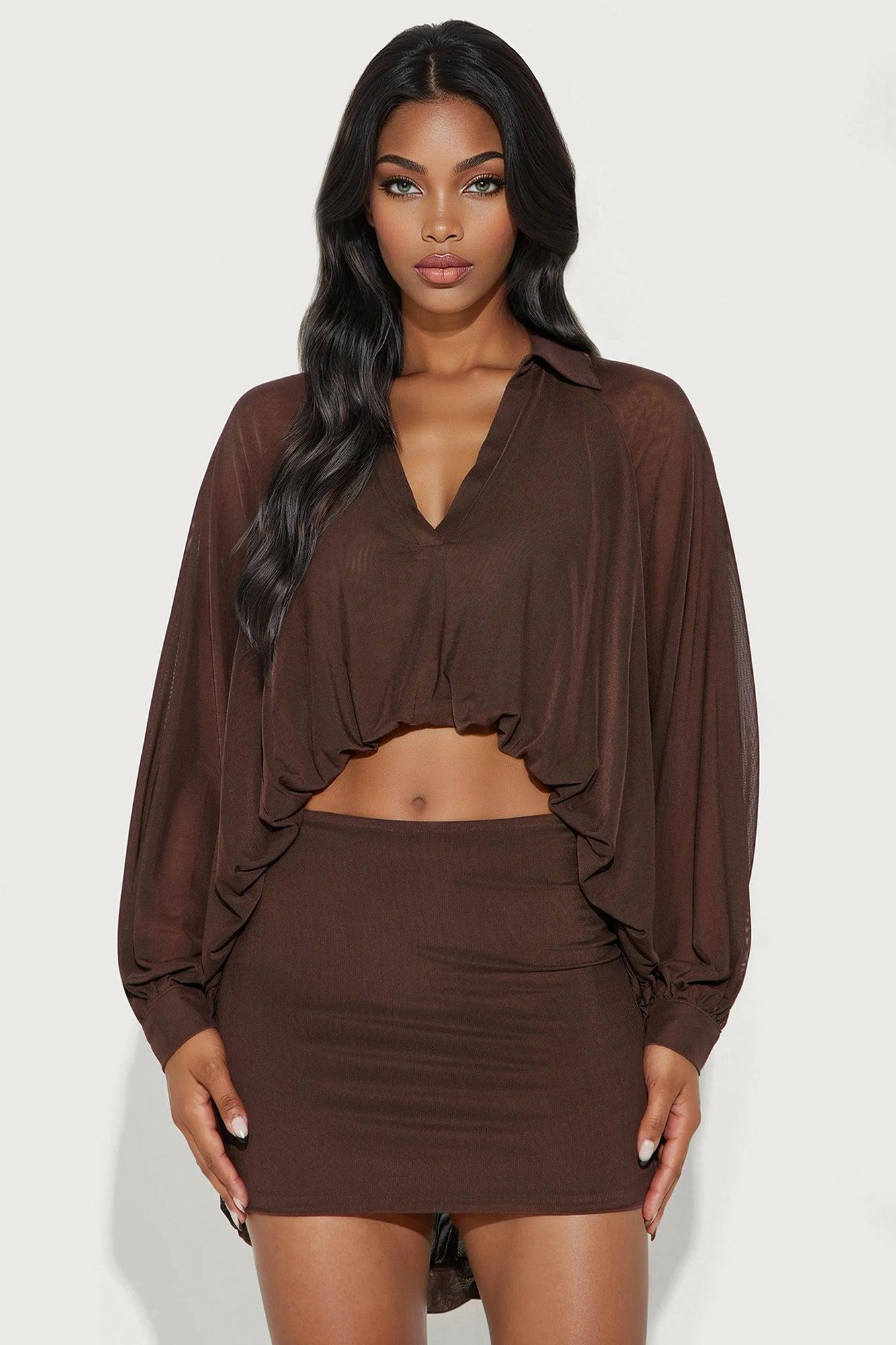 Available In Chocolate And Purple. 2 Piece Ensemble Bubble Hem Blouse And Mini Skirt Set Stretch Skirt Length 14" High Low Hem On Top Lined Elastic Waistband On Skirt Top & Bottom Self: 93% Polyester 7% Spandex Lining: 95% Polyester 5% Spandex Imported