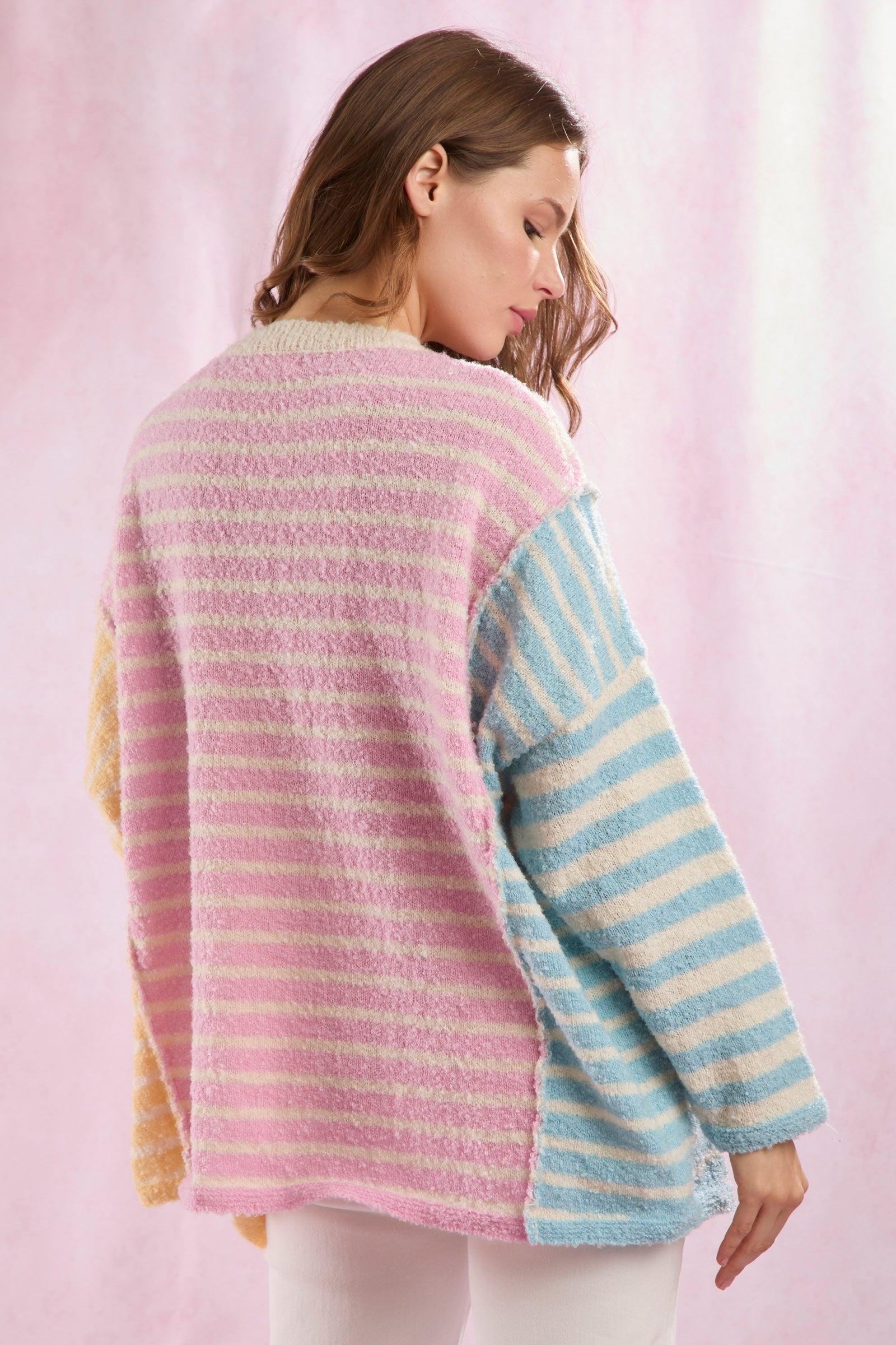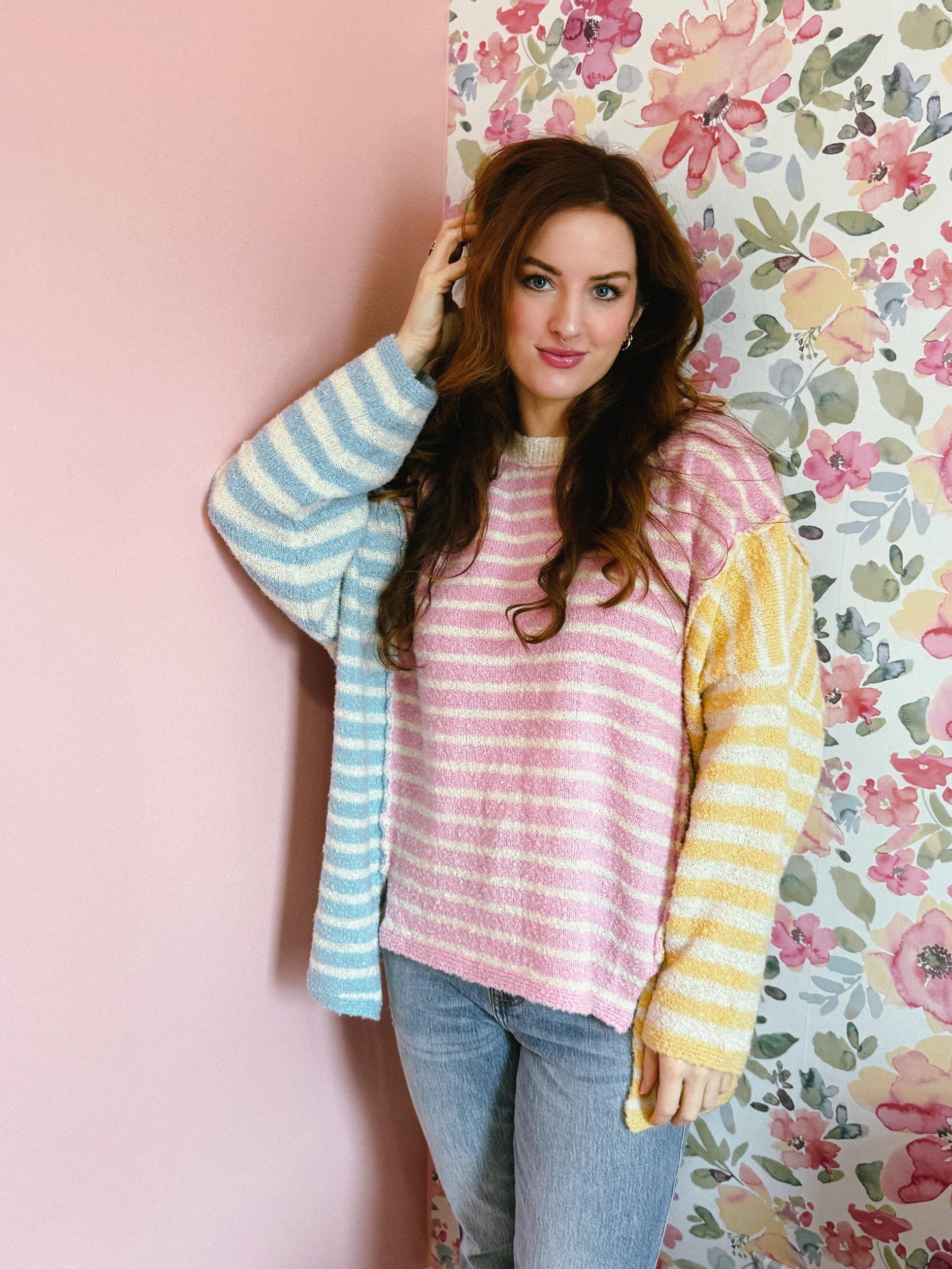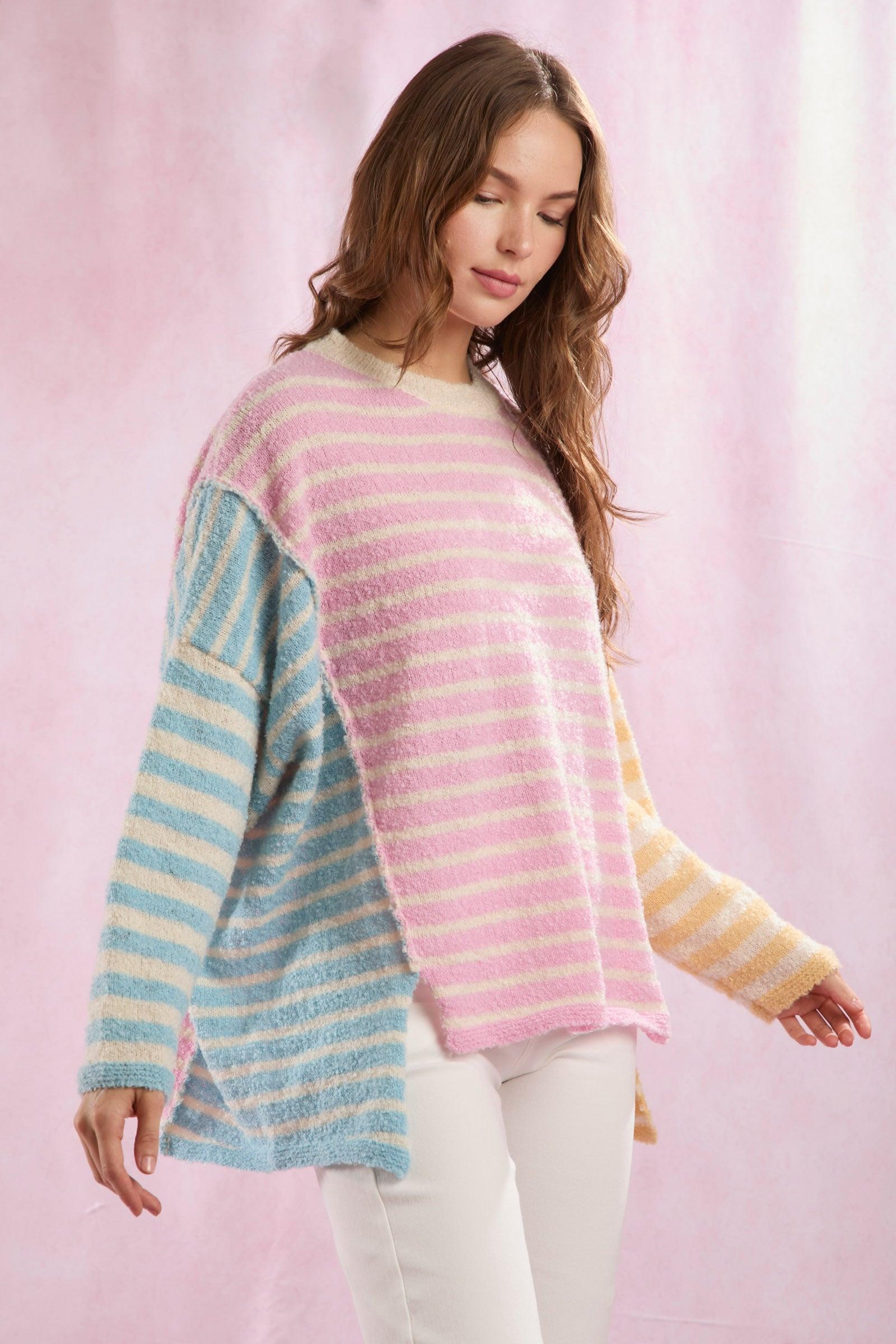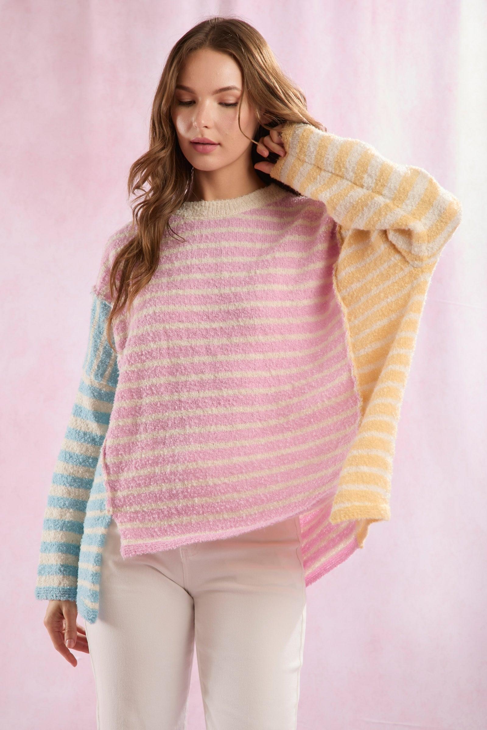 Add a pop of playful color to your wardrobe with the Aimee Pastel Striped Sweater. This loose-fitting sweater features a trendy color block stripe design, perfect for adding a touch of quirkiness to any outfit. Stay cozy and stylish with this must-have sweater!