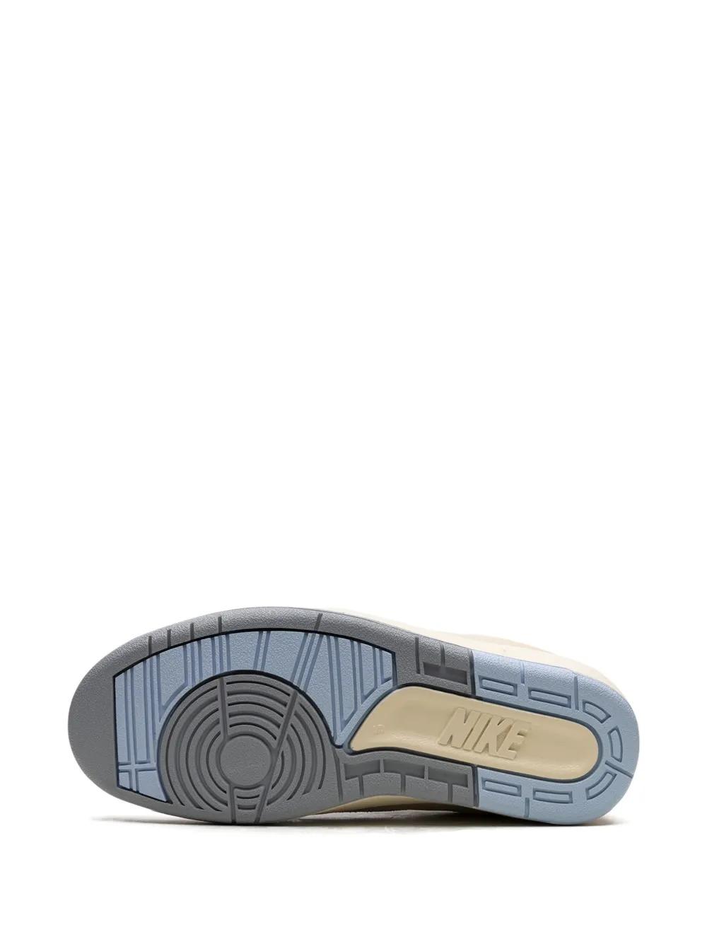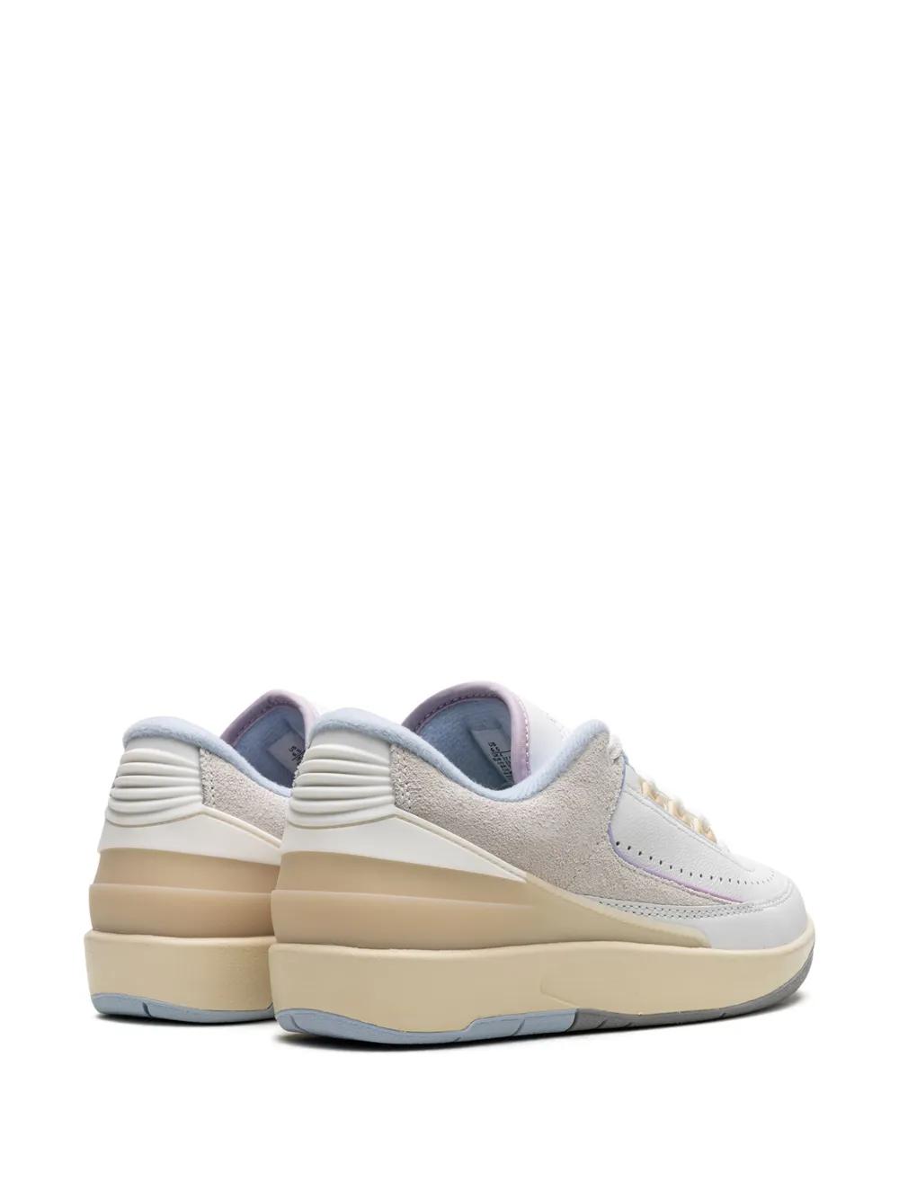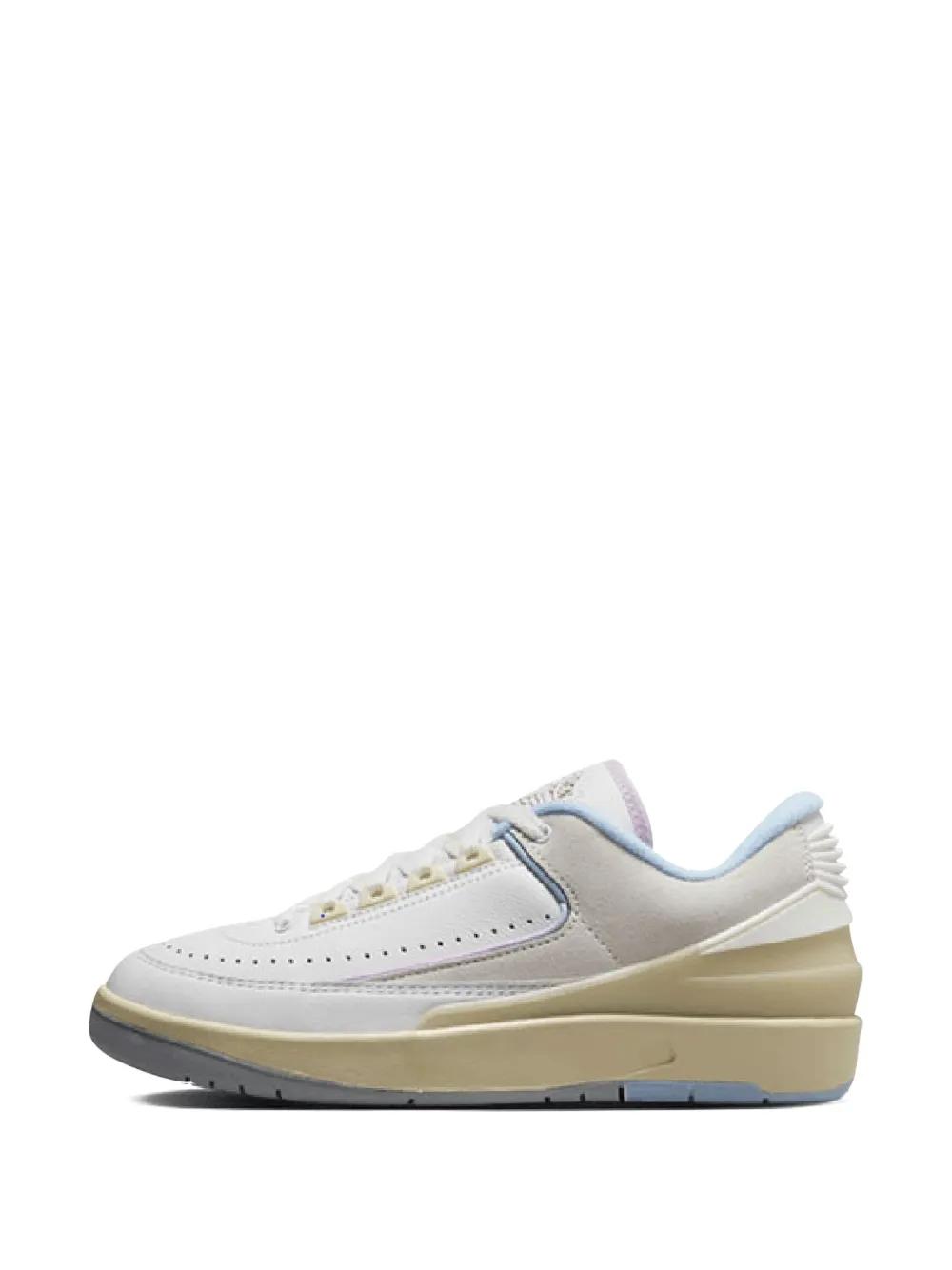 Nike's Air Jordan 2 Low "Look Up In the Air" is a women's-exclusive colourway inspired by one of the model's classic advertisements from 1987 - which featured an image of Michael Jordan dunking in a white Air Jordan warm-up suit with a blue, purple, pink sky in the background and the phrase 'Look, Up In the Air' printed below. This basketball-inspired sneaker has a white leather construction, with grey suede panels on the collar, and is enhanced by a gradient purple-to-blue piping along the overlay panels.