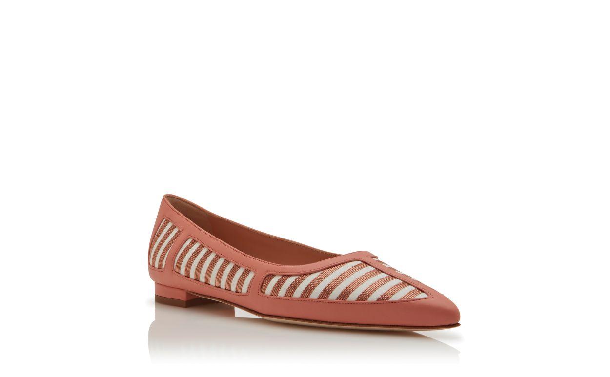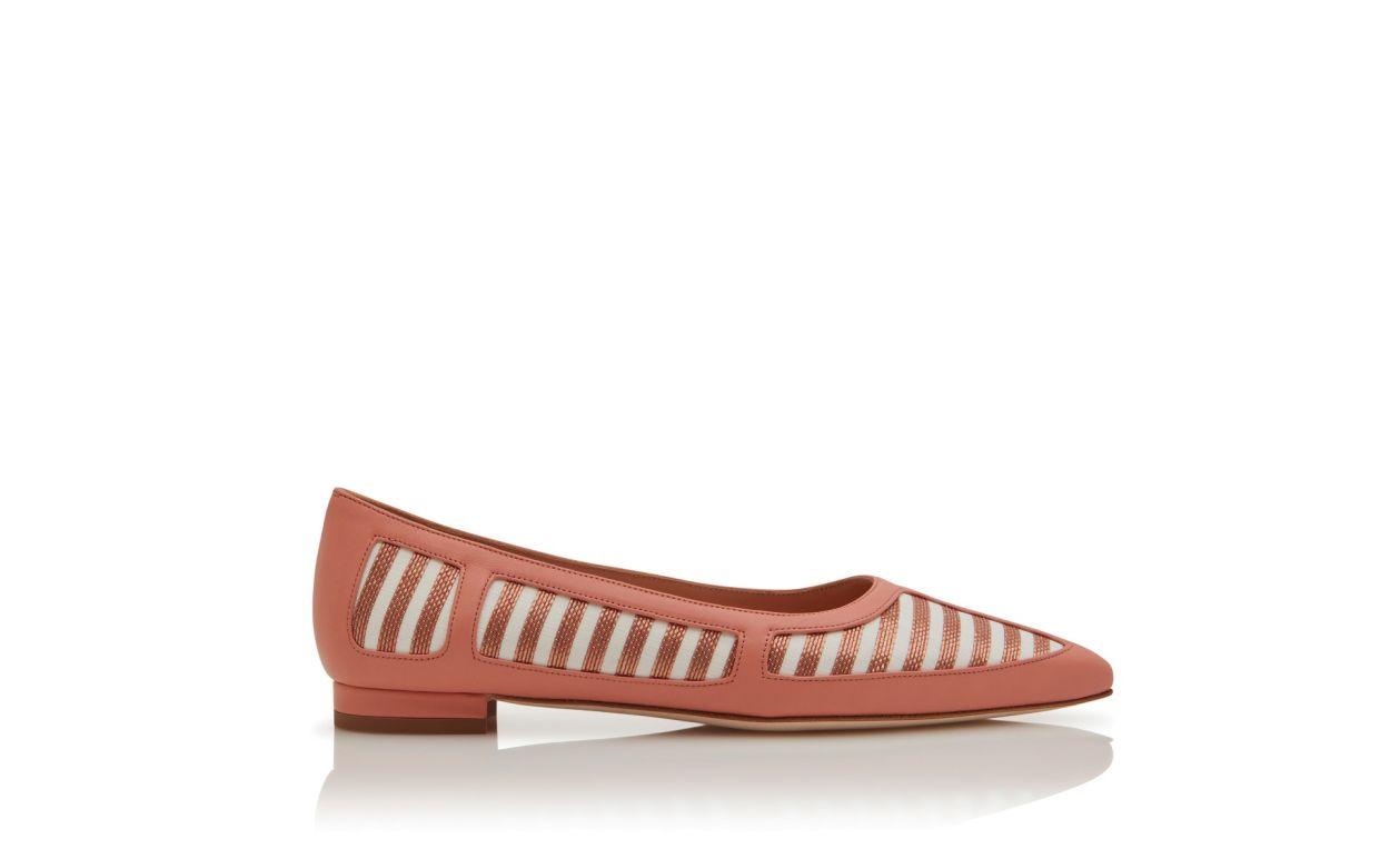 Coral and brown nappa leather pointed toe striped flat pumps featuring nappa leather edging details and flat stacked heel.