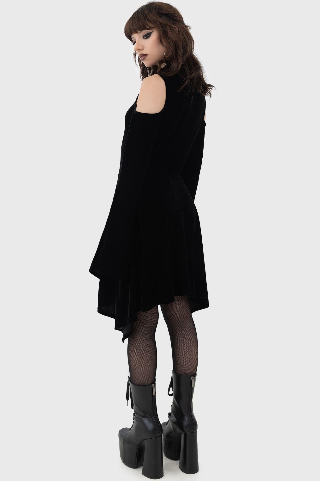 ALACINE.- Soft velvet.- Long, flared sleeves.- Mini length.- Side dip hem.- Cold shoulder. - Mesh moon detail.- High neck.- Fitted.With KILLSTAR branding, 95% Polyester 5% Elastane.Machine wash cold (30°c) / Do not bleach / Do not tumble dry / Iron at low temperature / Do not dry clean. Imported.