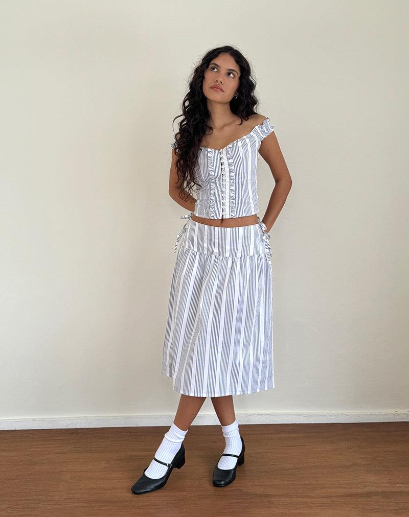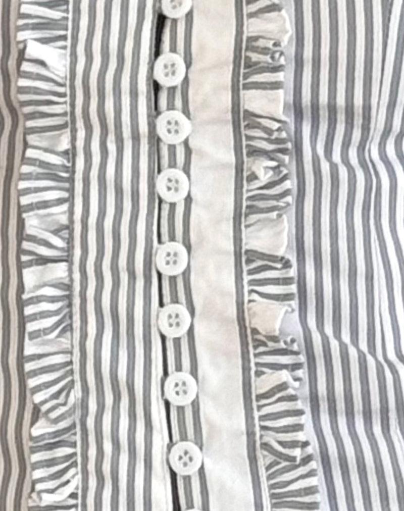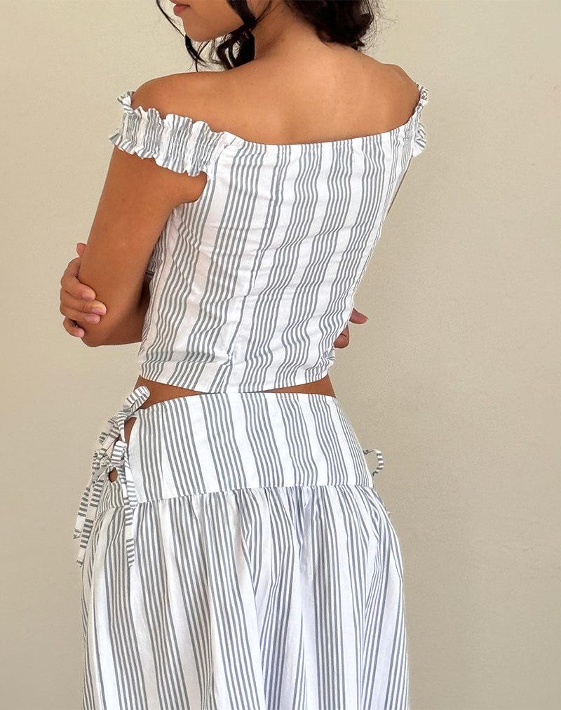 Our Alderidge top features a bodycon, corset style fit with a bardot neckline and cap sleeves with frill detail. Complete with button fastening down the centre front in a vertical grey stripe woven fabric. Pair with our matching Sasay midi skirt. MODEL WEARS SIZE:EXTRA SMALL - MODEL HEIGHT:5'7