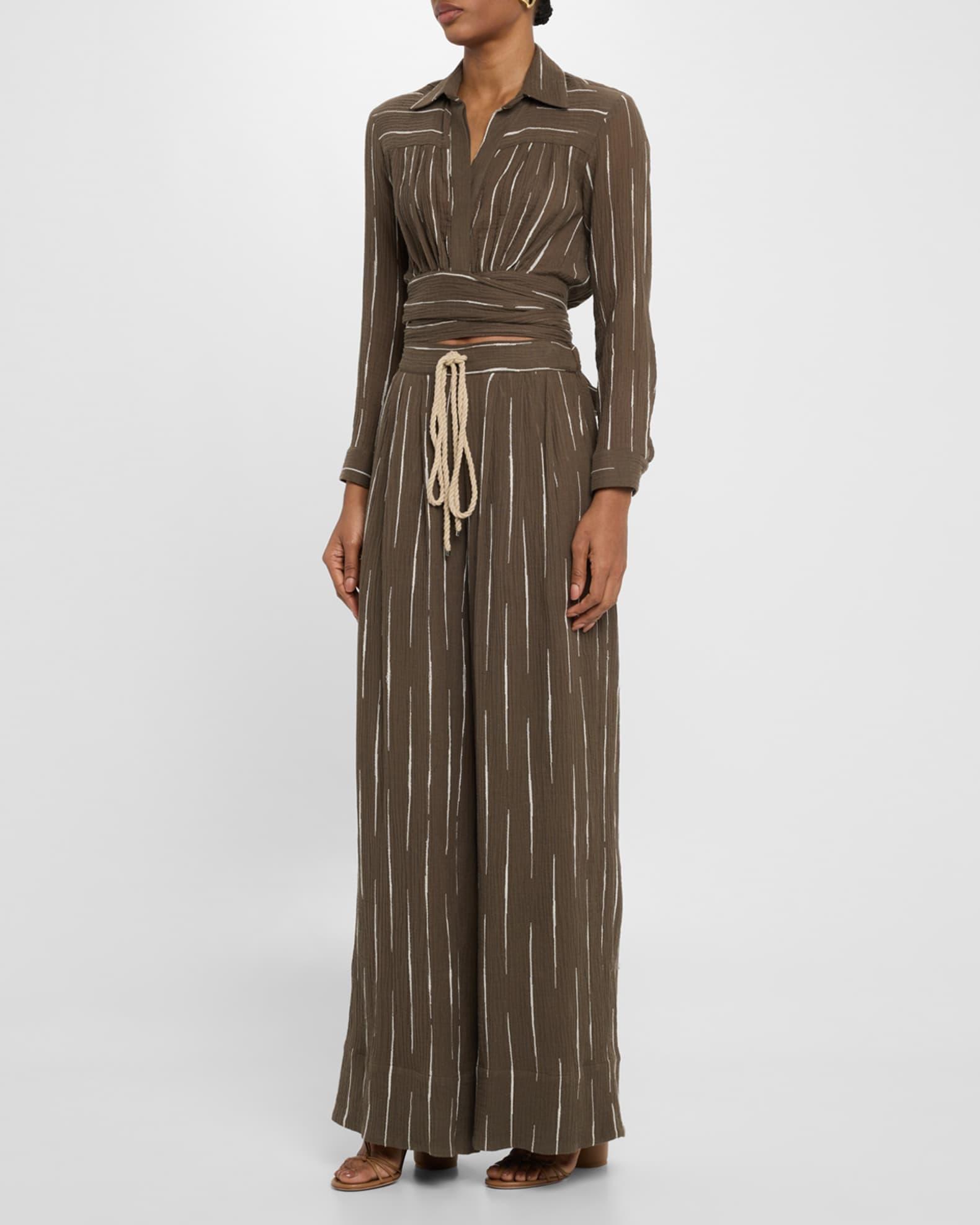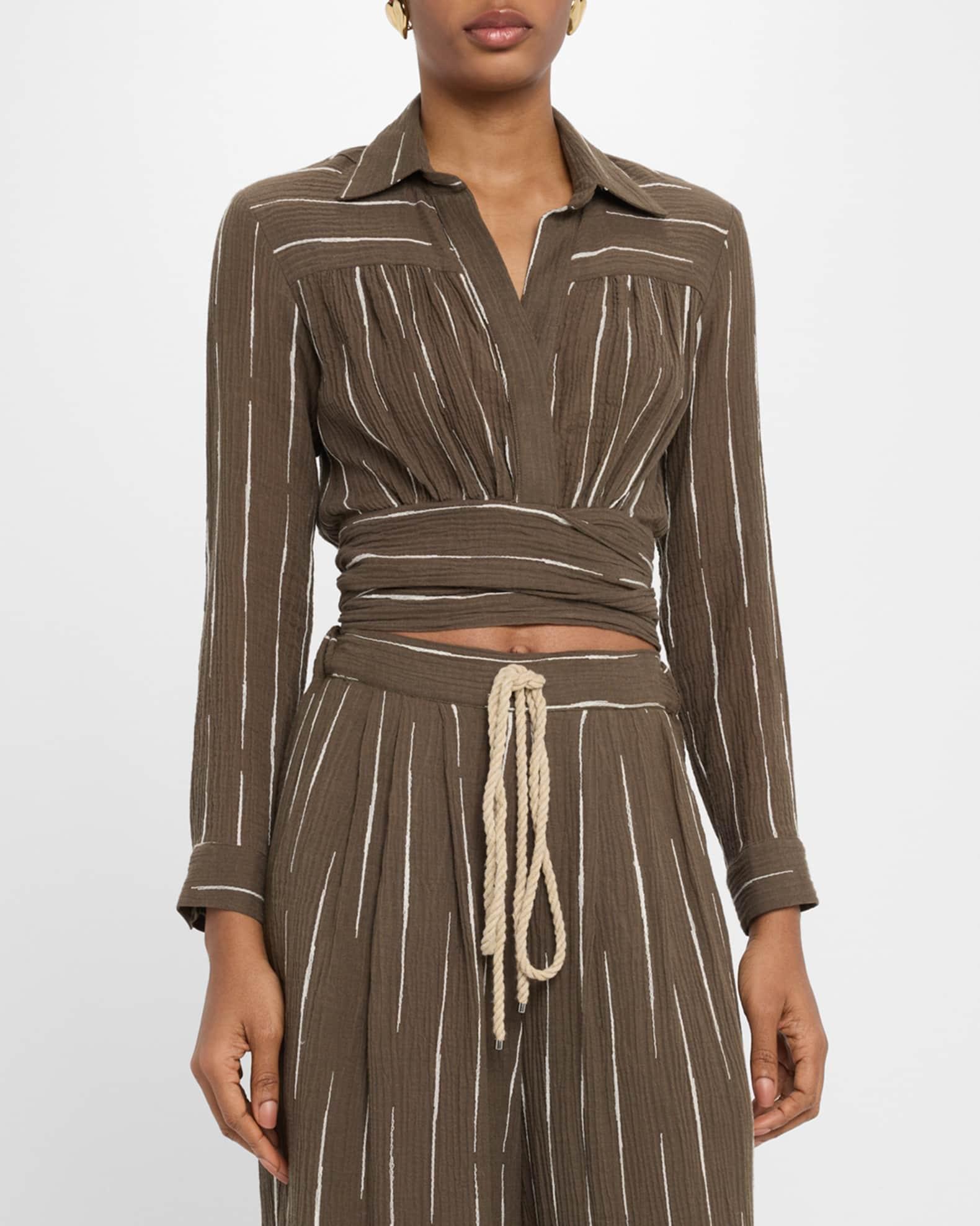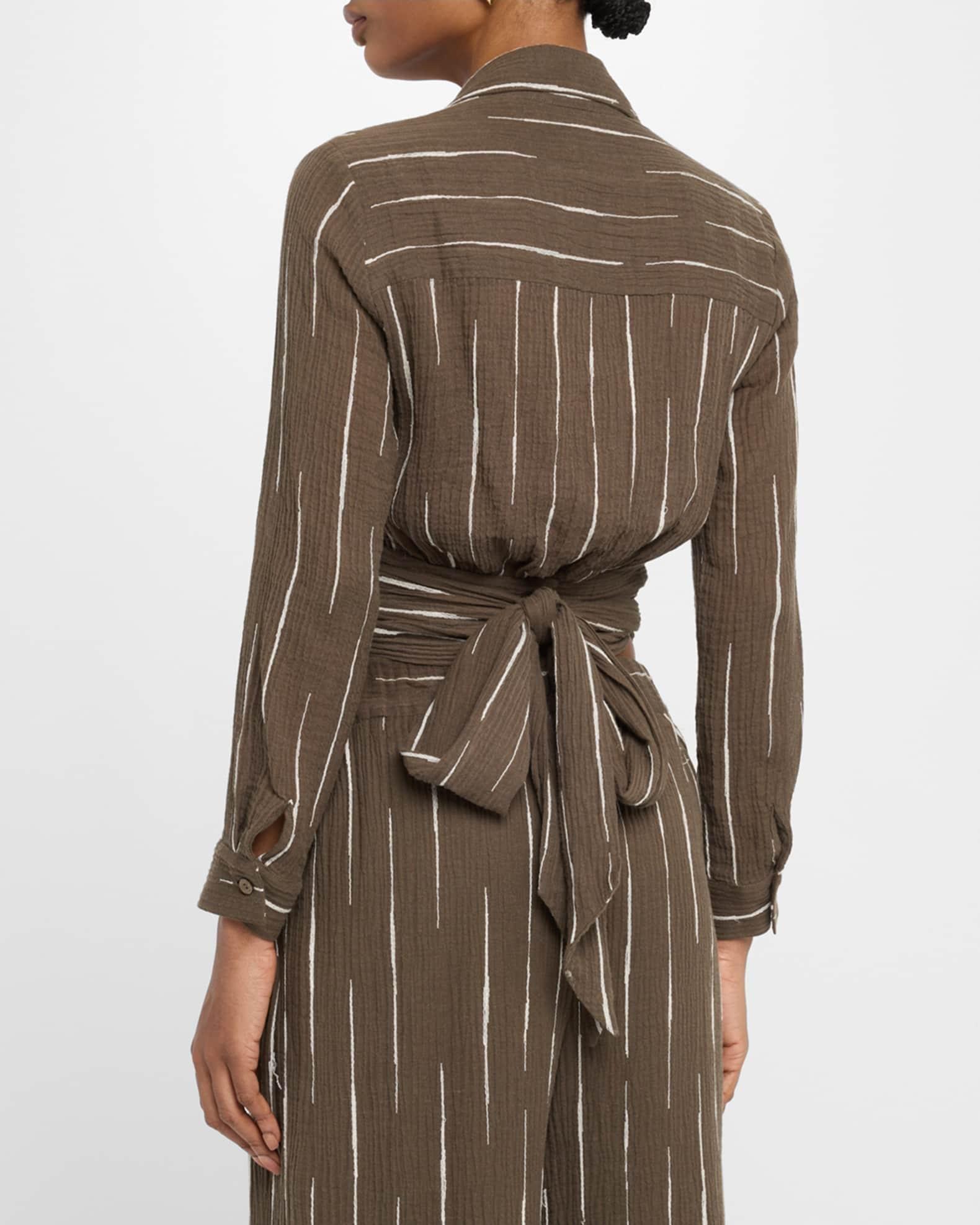 JBQ "Alessa" wrap-style top in a textured stripe construction with versatile self-ties Approx. 19"L from shoulder to hem Collared V neckline Long sleeves with button cuffs; approx. 23"L Yoked back Hip length Ramie/cotton Made in USA from imported materials