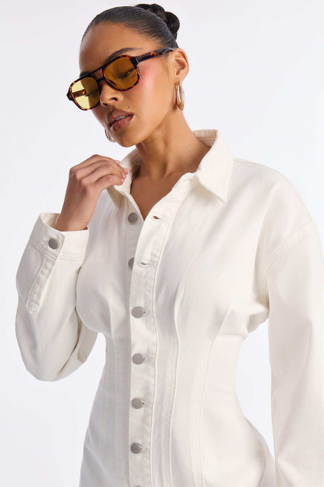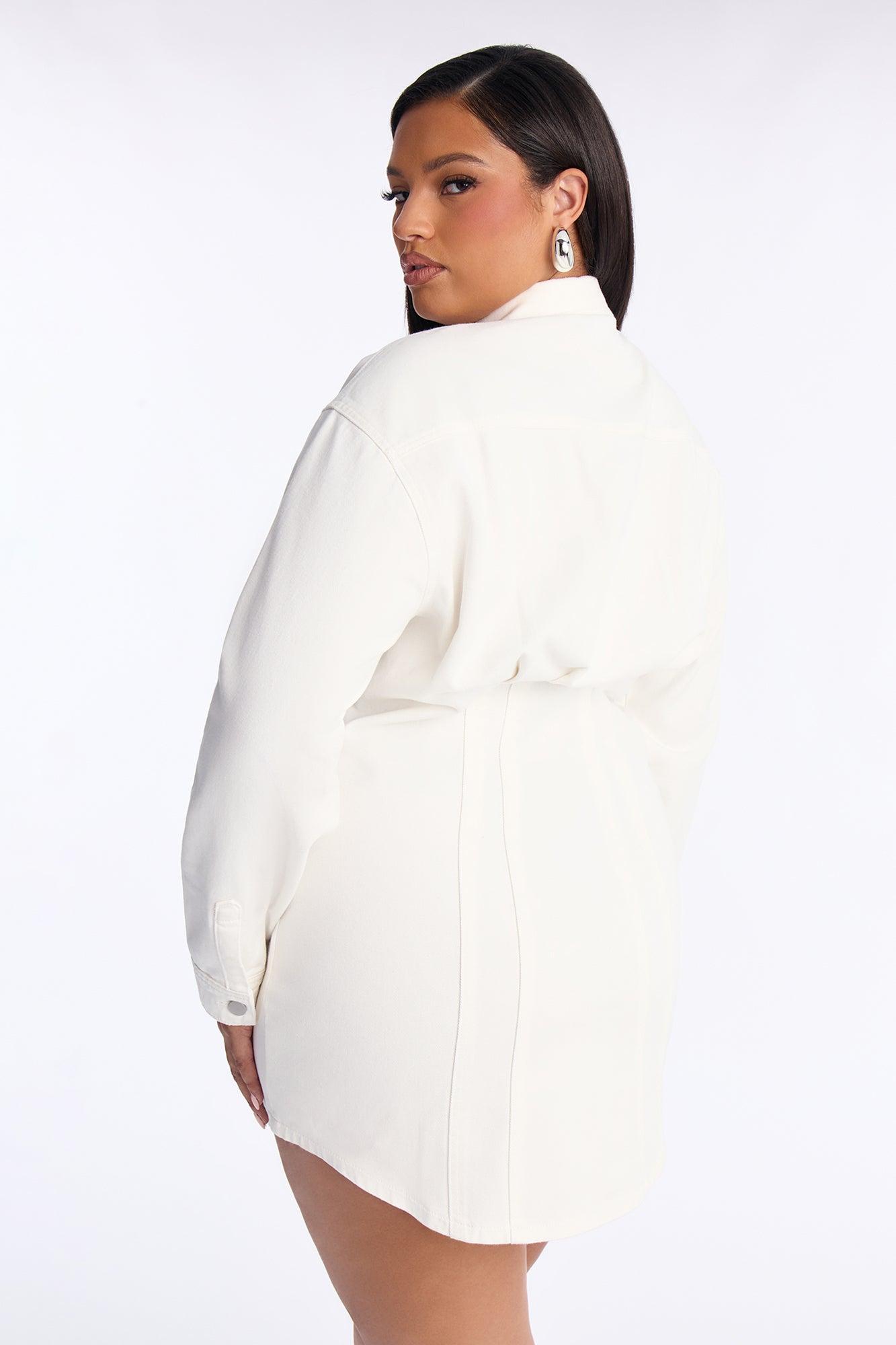 Available In Chocolate, Medium Wash And White. Denim Mini Dress Collar Neckline Long Sleeves Button Front Seam Detail Length = 33" Self: 100% Cotton Imported California Proposition 65WARNING: Cancer and Reproductive Harm - www.P65Warnings.ca.gov.
