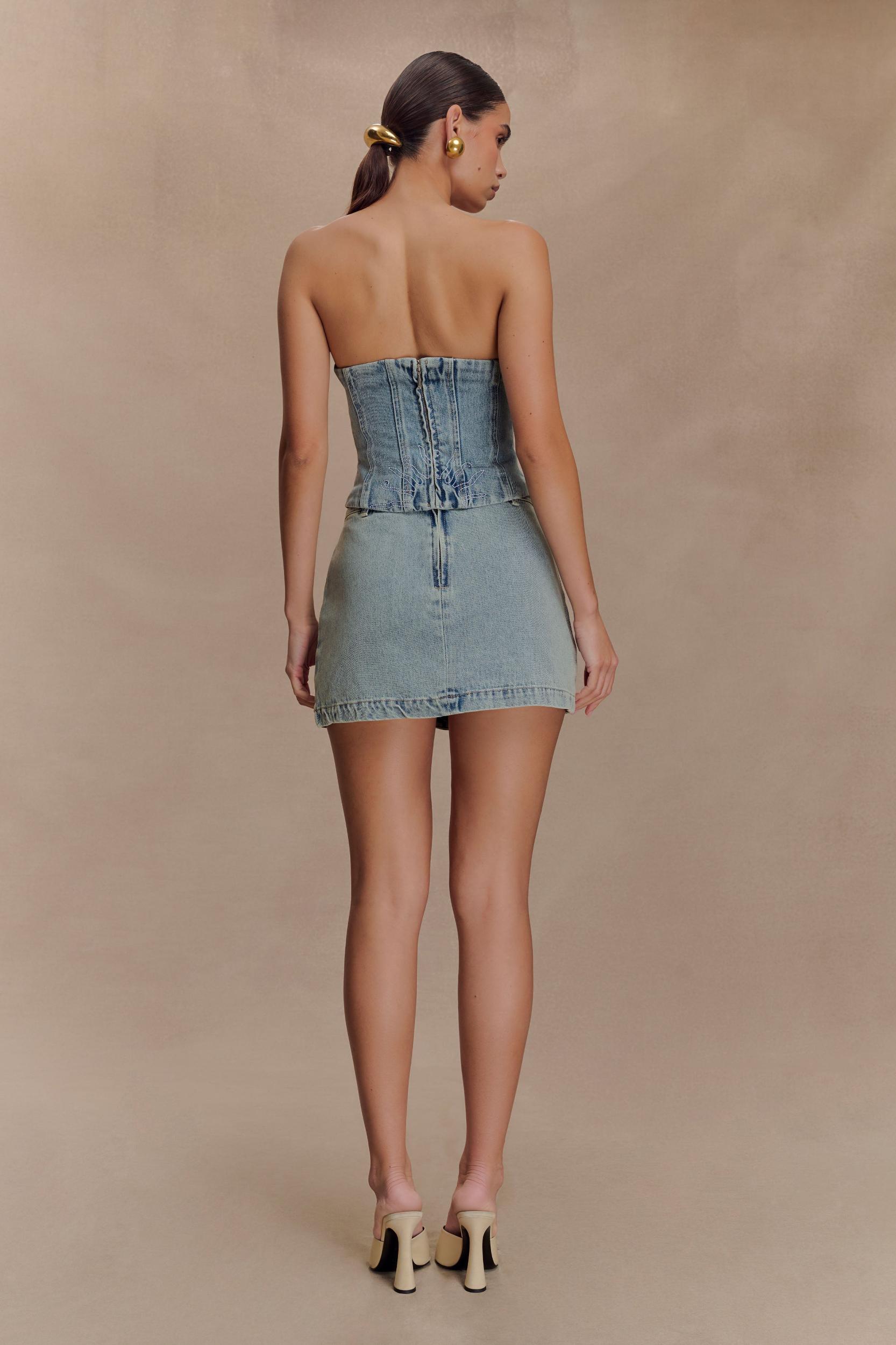 Sun-soaked denim. The ALESSIA Embroidered Denim Corset blends classic structure with a playful summer twist. This strapless design features a fitted bodice, longline silhouette, and a rounded front hem for a flattering shape. A back zip closure keeps the fit sleek and secure, while a delicate sun embroidery detail adds a touch of resort-ready charm. Style it with linen trousers or a flowy skirt for an effortless mix of polish and ease—perfect for long lunches, golden hour moments, or coastal city strolls.