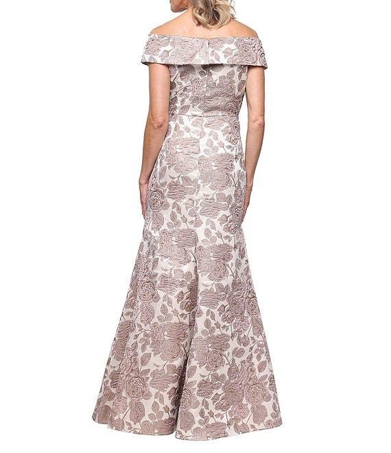 From Alex Evenings, this dress features: Jacquard fabrication Off-the-shoulder neckline Sleeveless Floral jacquard Mermaid silhouette Lined Center back zipper closure Approx. 57" in length Polyester/metallic Hand wash Imported.
