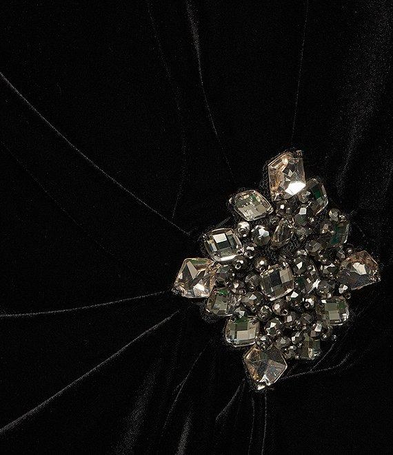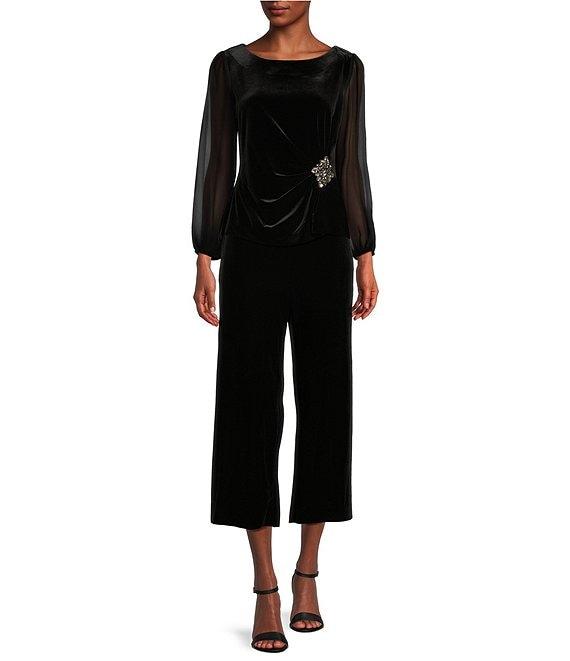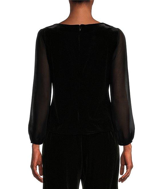 Alex Evenings Long Illusion Sleeve Scoop Neck Embellished Waist Stretch Velvet Blouse