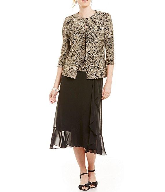 From Alex Evenings, this 2-piece twinset features: Jacket: Slinky glitter fabrication Round neckline 3/4 sleeves Printed 2-piece detached twinset Hook and eye closure Approx. 23.5" length Acetate/spandex Handwash/flat dry Tank: Slinky glitter fabrication Scoop neckline Sleeveless Printed 2-piece detached twinset Lined Pullover construction Approx. 15.25" length Acetate/spandex Handwash/flat dry Imported.