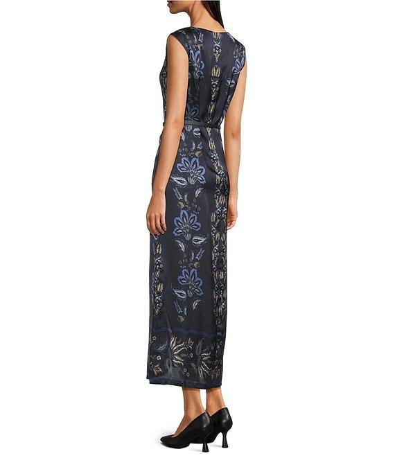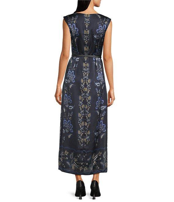 From Alex Marie, this dress features: Printed satin fabrication Boat neckline Cap sleeves Unlined Black skinny belt with gunmetal hardware 2 side seam pockets Invisible zipper and hook & eye closure at center back Approx. 54" in length Polyester Machine wash cold Imported.