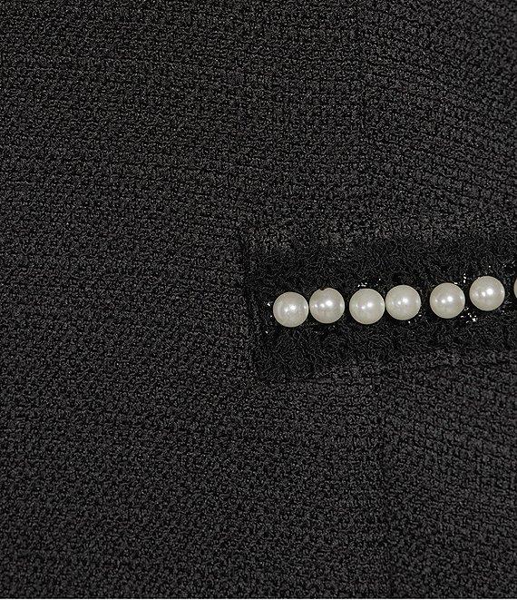 From Alex Marie, this dress features: Boucle fabrication Crew neckline Short sleeves Lined Invisible zipper and hook & eye closure at center back Pearl detailing Approx. 35" in length Polyester blend Dry clean only Imported.