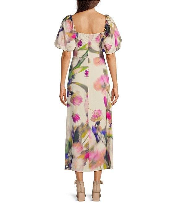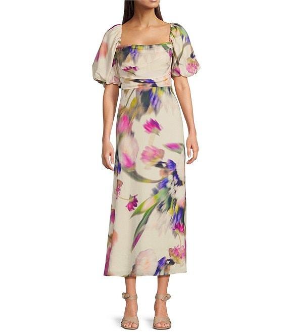 From Alex Marie, this gown features: Printed floral linen fabrication Square neckline Short sleeves Lined Zip back - partial Approx. 51" length Viscose/linen Dry clean Imported.