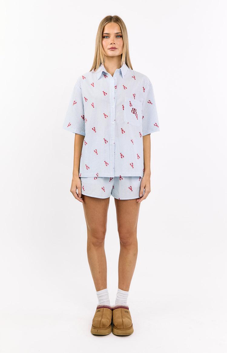 Blue Stripe Lobster Print Pajama ShirtHow to Style:Lounge in style with our Alexea Lobster Print Pajama Shirt, the perfect choice for a comfortable night's sleep or a lazy weekend morning! This adorable shirt features a classic blue and white stripe fabric, a fun all-over lobster print, and a chest pocket with our signature embroidery detail. Pair it with the matching shorts to complete the cute set, or wear it on its own for a comfy and stylish sleepwear look!Features: Function button up front Pocket on chest with embroidery detail Collar Printed stripe fabric Perfect for sleepwear, casual lounging, and Euro summer!