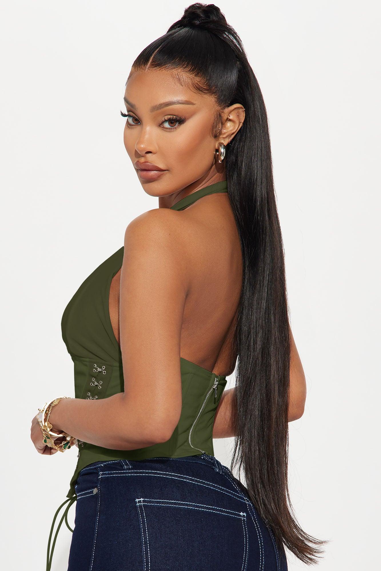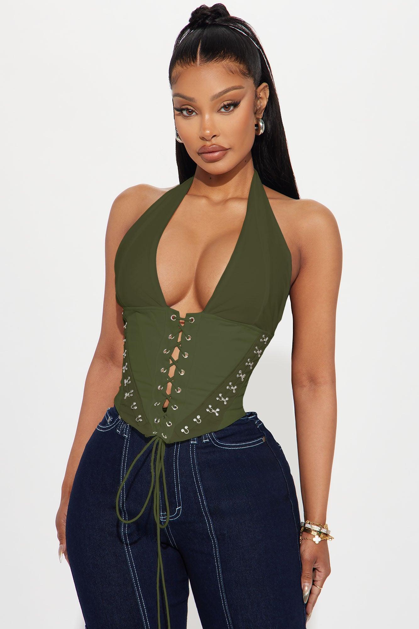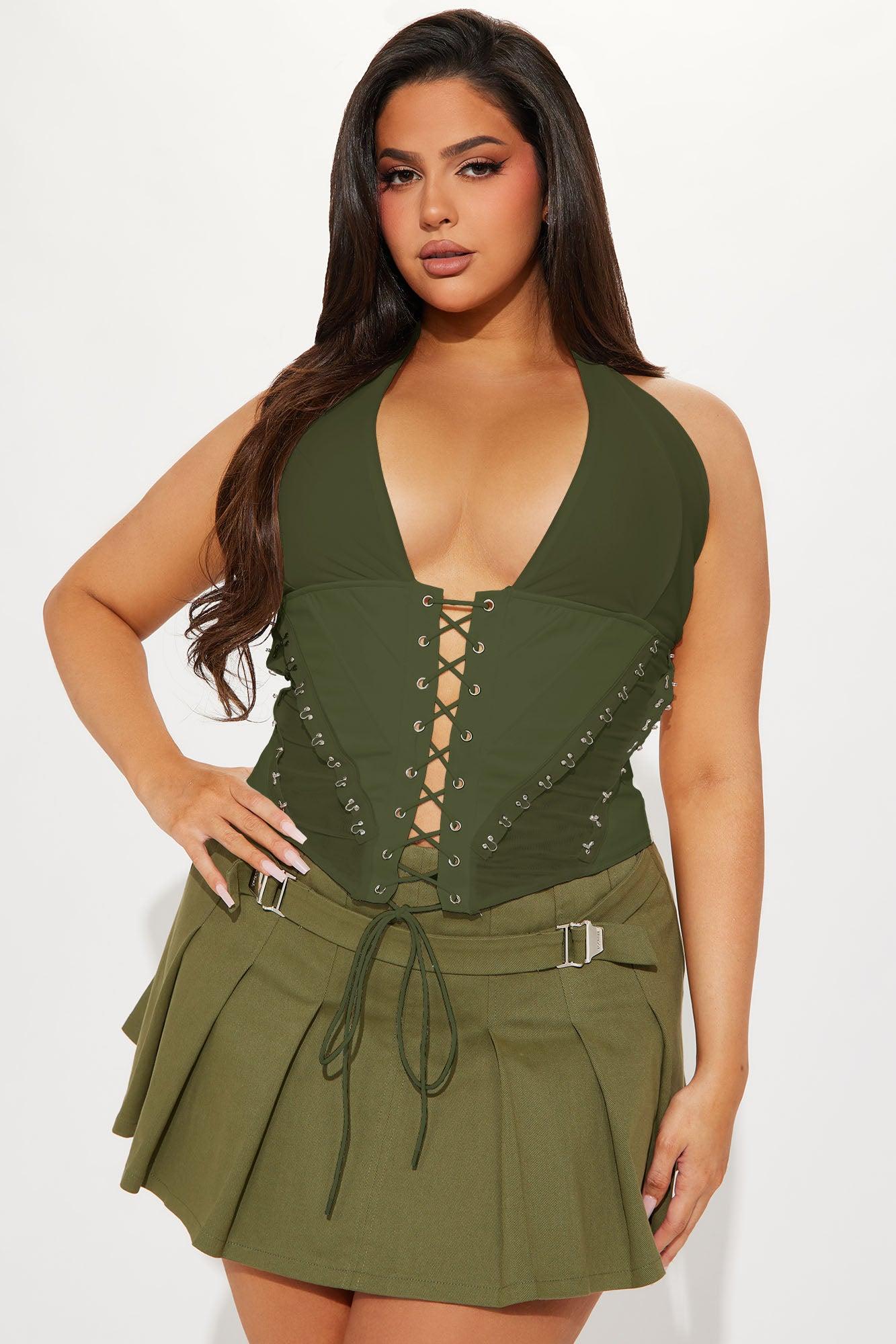 Available In Black, Burgundy, Olive And White. Halter Top Sleeveless Lace Up Detail Hook And Eye Detail Back Zipper Closure Mesh Stretch Self: 96% Polyester 4% Spandex Contrast: 95% Polyester 5% Spandex Lining: 100% Polyester Imported California Proposition 65WARNING: Cancer and Reproductive Harm - www.P65Warnings.ca.gov.