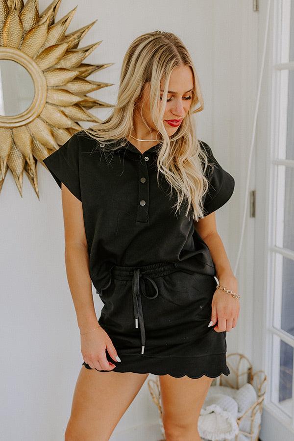 - This skort is here to steal the spotlight! With its adorable scalloped detailing, it's the perfect mix of fun and flirty for sunny days ahead. - Stretchy material - An elastic waistline with a functional drawstring - Built-in shorts with a mini skirt overlay - A flattering silhouette that ends in a scalloped hemline