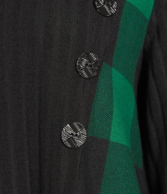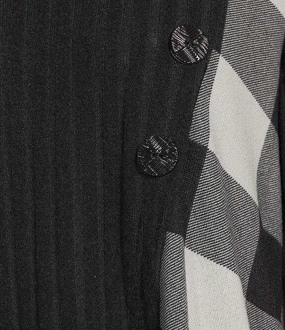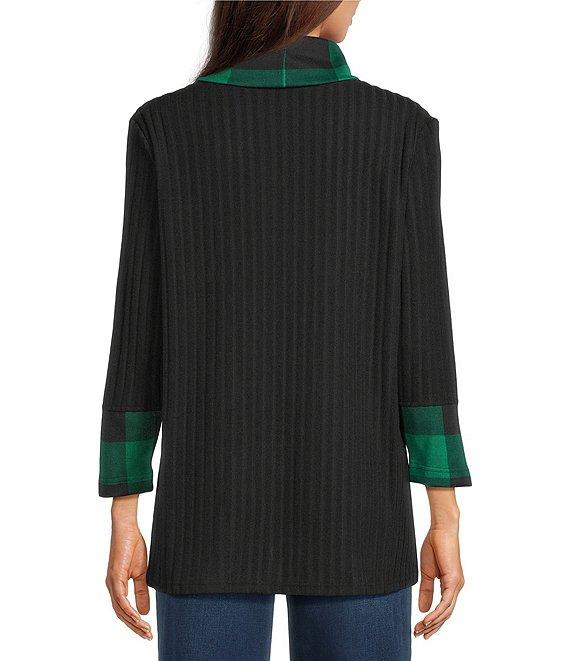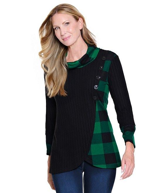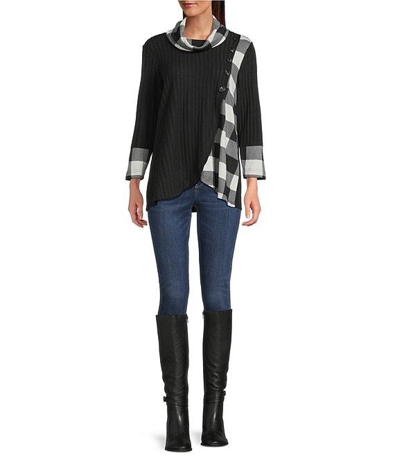 From Ali Miles, this tunic features: Textured knit fabrication Cowl neckline 3/4 sleeves Brushed buffalo plaid Slight High-low overlapped hem Pullover construction Approx. 25' center front 28" center back length Polyester/spandex Machine wash/tumble dry Imported.