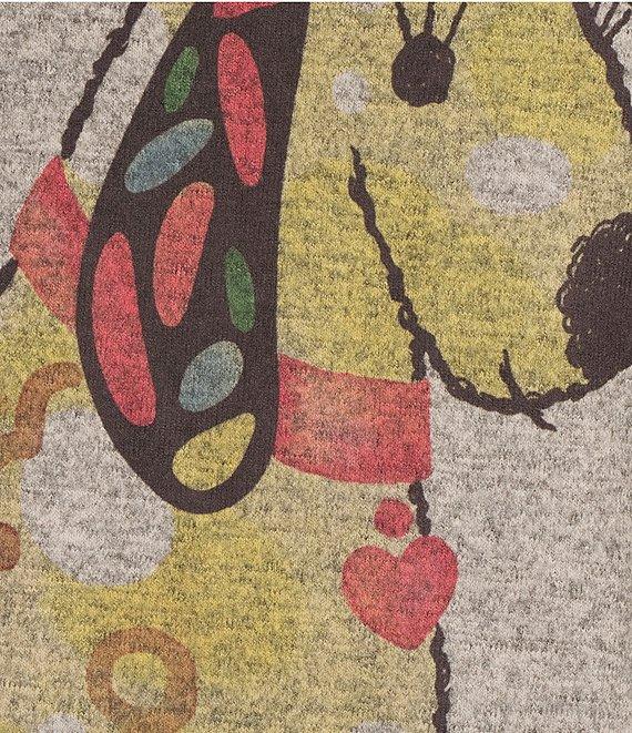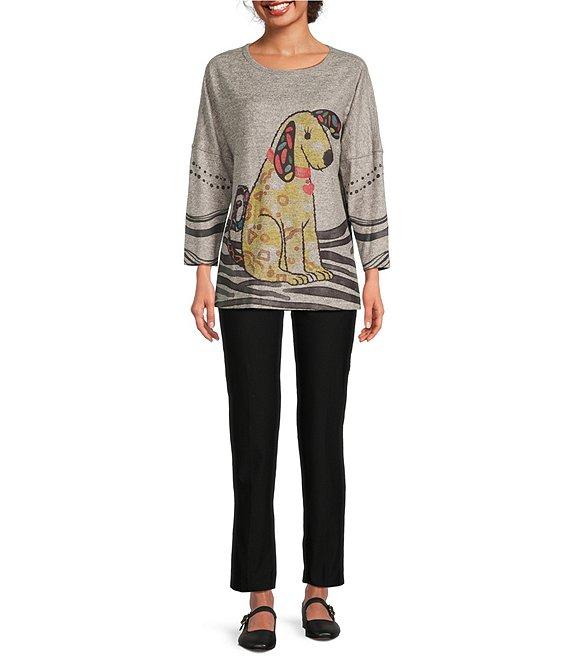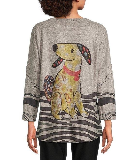 From Ali Miles, this tunic features: Brushed knit fabrication Round neckline Long sleeves Dropped shoulders Novelty abstract dog print with stripes Curved hi-low hem Approx. 27" center front length; 28.5" center back Polyester/spandex Machine wash/tumble dry low Imported.