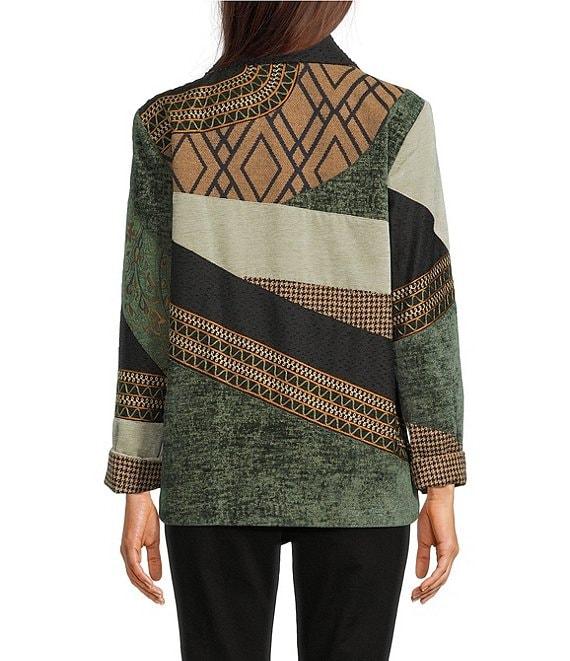 From Ali Miles, this jacket features: Woven fabrication Point collar Long sleeves Geometric patchwork print Embroidered trim Straight hem Button-front closure Approx. 28" length Polyester Machine wash/tumble dry low Imported.