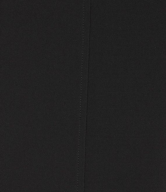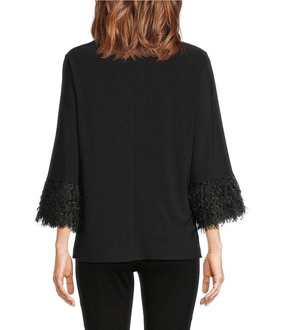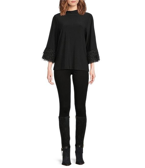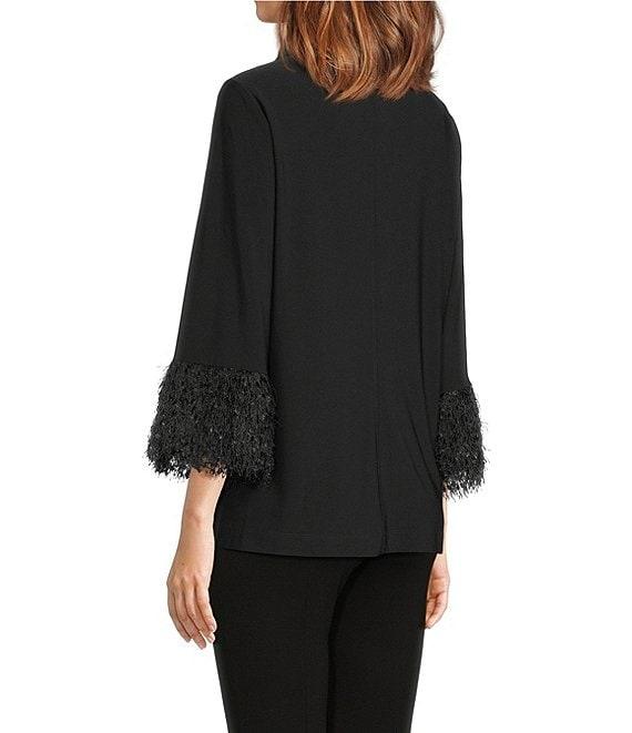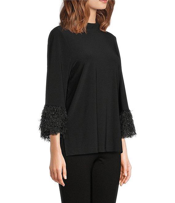 From Ali Miles, this tunic features: Knit fabrication Stand collar 3/4 sleeves with fringe cuffs Straight hem with side slits Pullover construction Approx. 25" length Polyester/spandex Machine wash inside out/tumble dry low Imported.