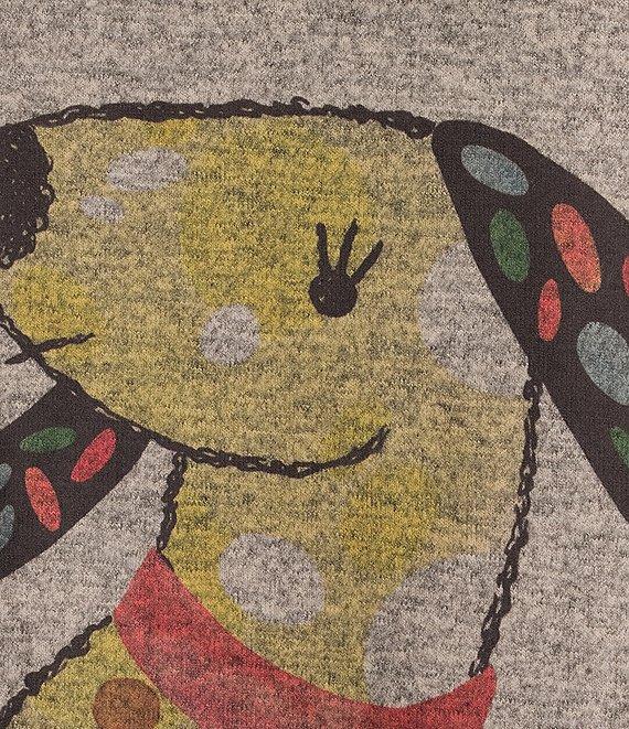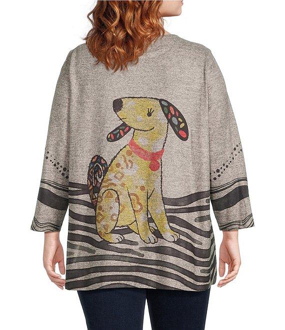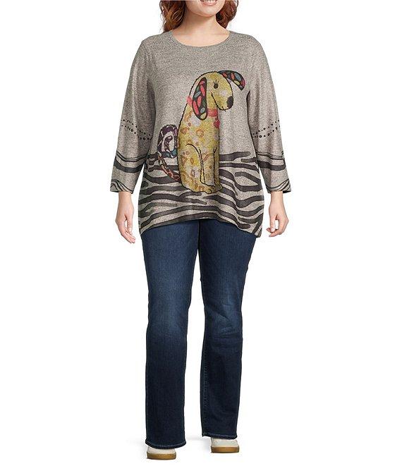 From Ali Miles Plus, this tunic features: Brushed knit fabrication Round neckline Long sleeves Dropped shoulders Novelty abstract dog print with stripes Curved hi-low hem Approx. 28" center front length; 29.5" center back Polyester/spandex Machine wash/tumble dry low Imported.
