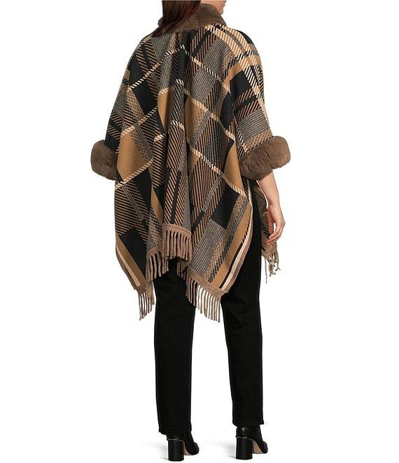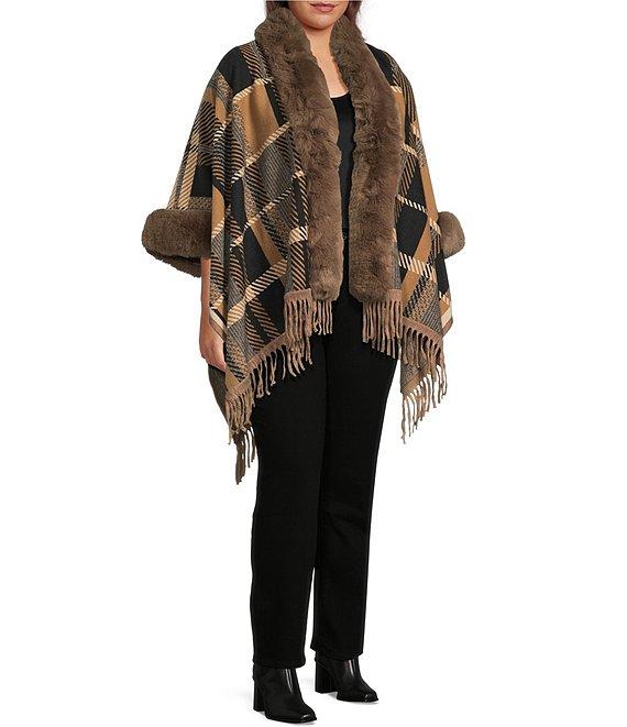 Ali Miles Plus Size Plaid Faux-Fur Trim Fringe Hem Cozy Open-Front Jacket