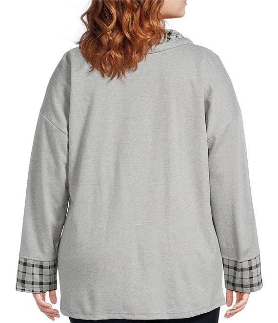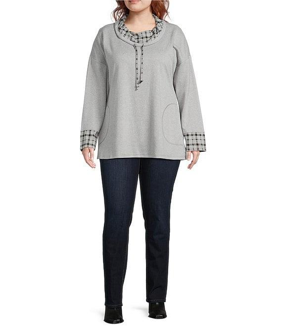 From Ali Miles Plus, this tunic features: Brushed knit fabrication Cowl neckline with ties Long sleeves Solid with plaid multi print on neck, ties and cuffs Side functional pockets Straight hem Pullover construction Approx. 29" length Rayon/polyester/spandex Machine wash/tumble dry low Imported.