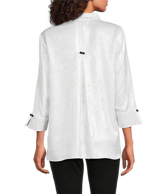 From Ali Miles, this tunic features: Shimmer woven fabrication Wire collar 3/4 sleeves Solid Straight hem with side vents Button front closure Approx. 28' length Polyester Machine wash/tumble dry Imported.