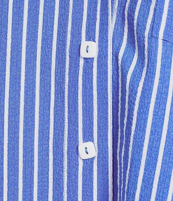 From Ali Miles, this tunic features: Woven fabrication Point collar neckline Elbow-length ruffle sleeves Stripe print Slightly curved hi-low hem with side vents Button-front closure Approx. 25.5" center front length; 27" center back Polyester/spandex Machine wash/tumble dry low Imported.