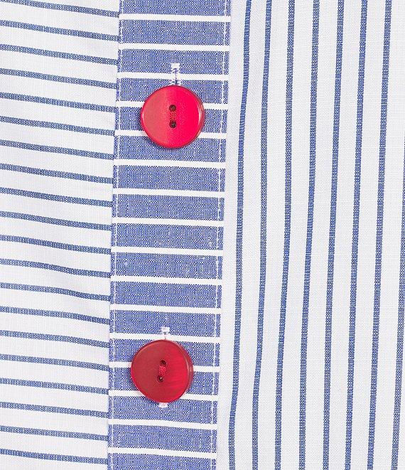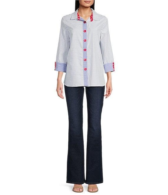 From Ali Miles, this tunic features:Yarn-dye stripe shirtPoint collar3/4 sleeves with contrasting color cuffContrast trim Hi-low shirttail hemButton-front closureApprox. 28" lengthCottonMachine wash cold/tumble dry lowImported.