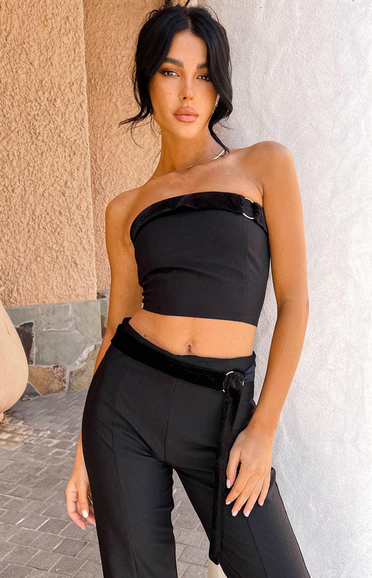 Black Strapless Velvet Belt Top HOW TO STYLE: Our black strapless belt top is a unique yet versatile piece to add to your wardrobe. Don't forget to grab the matching pants for a co-ordinated cool girl look. This set is perfect for your next cocktail event! FEATURES: Cropped length Velvet belt fold over detail at top hem Zip closure at back Lightweight material Lined Little to no stretch Strapless style