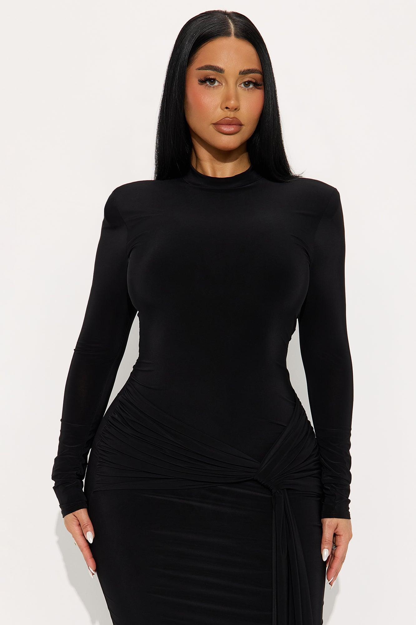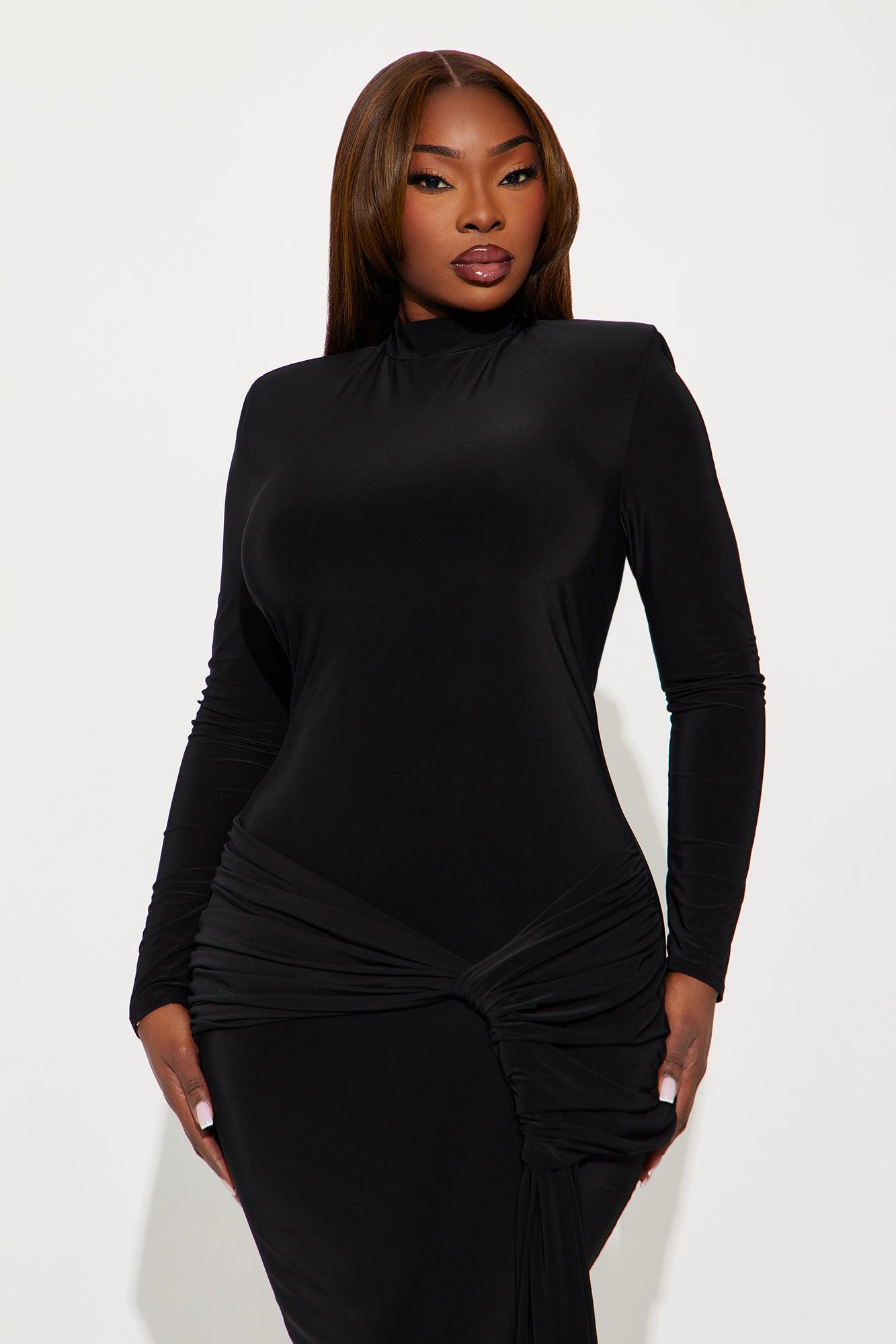 Available In Black And Olive. Maxi Dress Long Sleeve Shoulder Pads Mock Neckline Drape Detail Hidden Back Zipper Lined Stretch Self: 95% Polyester 5% Spandex Lining: 100% Polyester Imported California Proposition 65WARNING: Cancer and Reproductive Harm - www.P65Warnings.ca.gov.