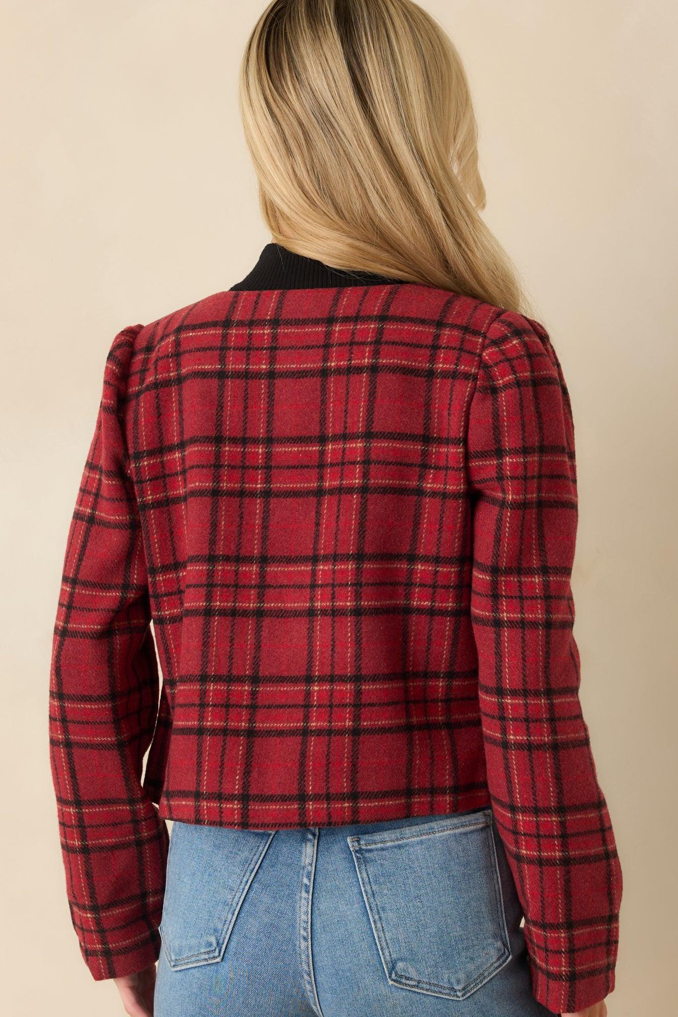A true wardrobe changer, this All In Good Taste Merlot Red Plaid Button Up Jacket brings a little boldness and a lot of polish to any look. The rich merlot red jacket feels instantly iconic, while the cropped silhouette keeps it modern and ready for wherever the day leads. This red cropped plaid jacket features a round neckline, long sleeves, front button closures, and flap pocket detailing, all crafted from a soft, textured woven fabric with full lining. 90% Polyester & 10% Rayon Lining: 100% Polyester Turn Inside Out, Machine Wash Cold Manufactured in Vietnam Designed in The USA Model is 5'6" and Wearing a Size Small
