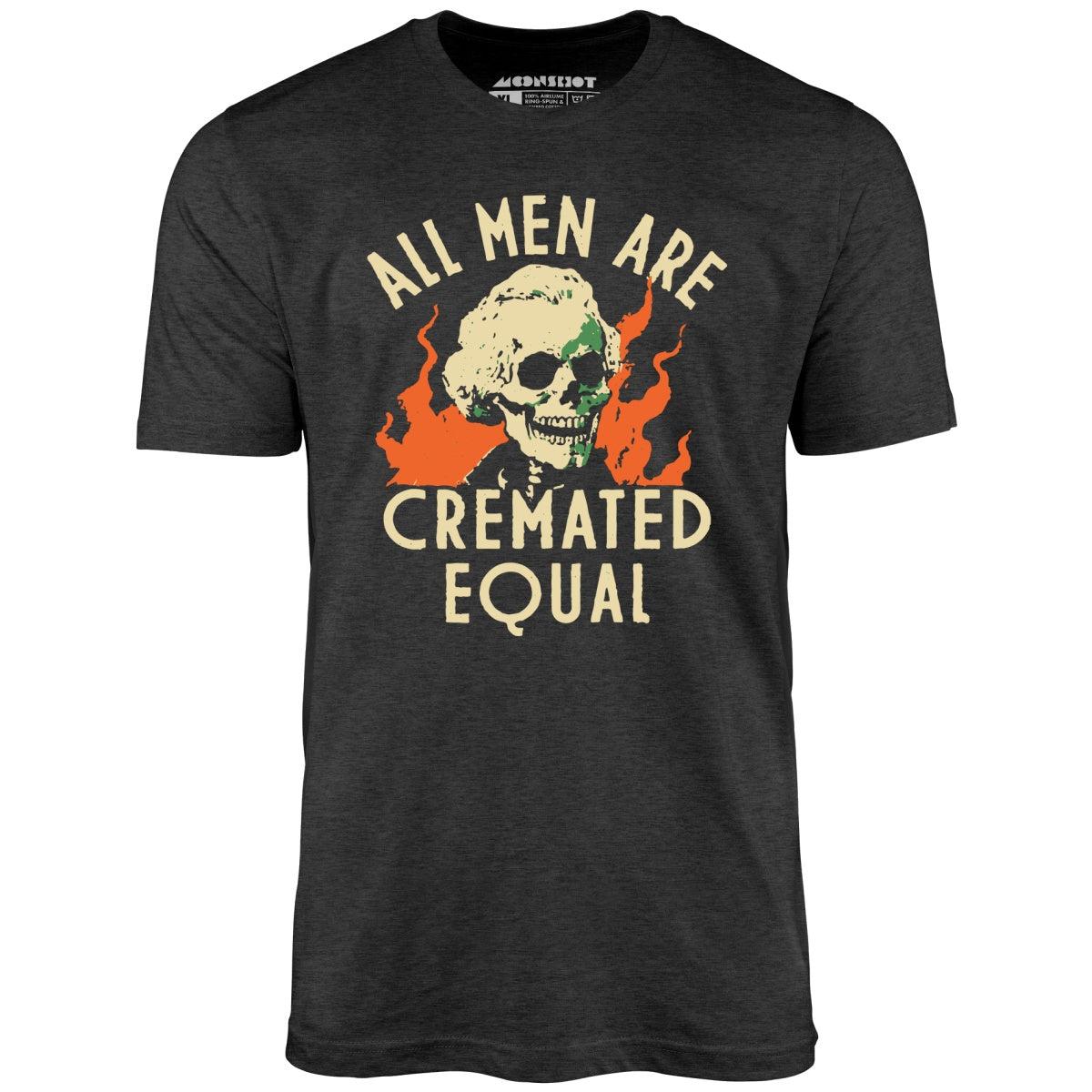 Looking for a spooky twist on a classic quote? Our "All Men Are Cremated Equal" design gives you just that—featuring a skeletal version of Thomas Jefferson (or is it?) proclaiming equality beyond the grave! This design combines clever humor with a hint of historical parody, perfect for those with a dark sense of humor who love Halloween. Printed on our super soft ring-spun & combed cotton unisex T-Shirt. Or upgrade to our Luxury vintage heather edition (cotton/poly blend) for an even softer, more durable, classic look. We print & ship all of our high quality graphic tees in the USA.