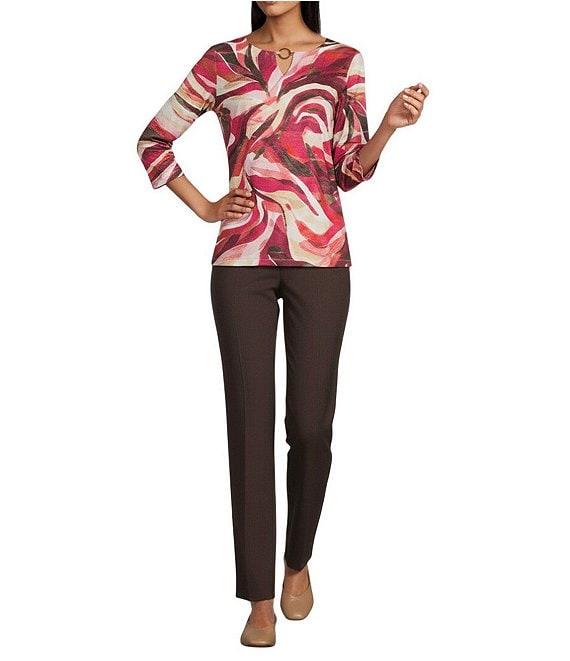 From Allison Daley, these pants feature: Tech stretch fabrication Straight leg silhouette Two front pockets Pull-on construction Approx. 30" regular; 28" short inseam Rayon/nylon/spandex Machine wash/tumble dry Imported.