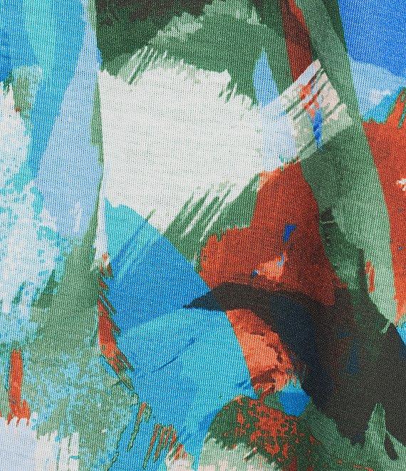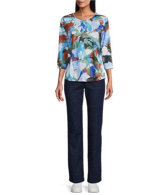 Allison Daley Petite Size Embellished Blue Artistry Painting Print 3/4 Sleeve Crew Neck Knit Top