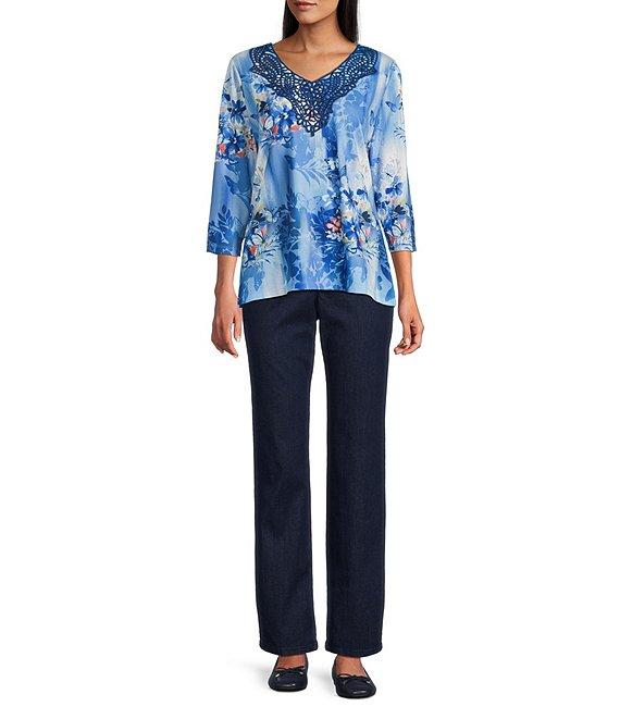 Allison Daley Petite Size Floral Print 3/4 Sleeve V-Neck Beaded Applique Knit Top