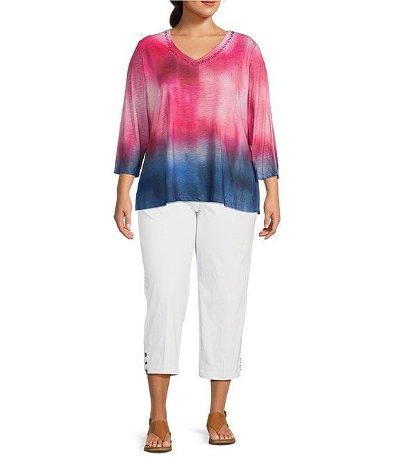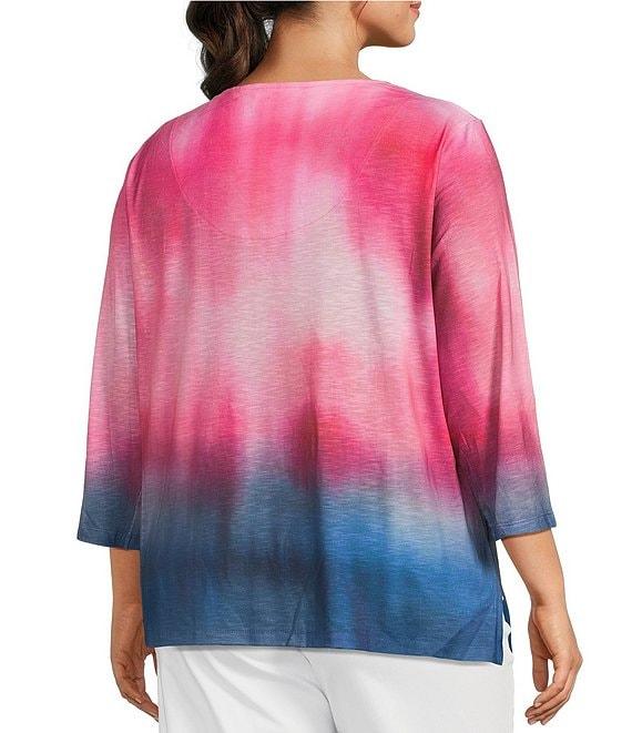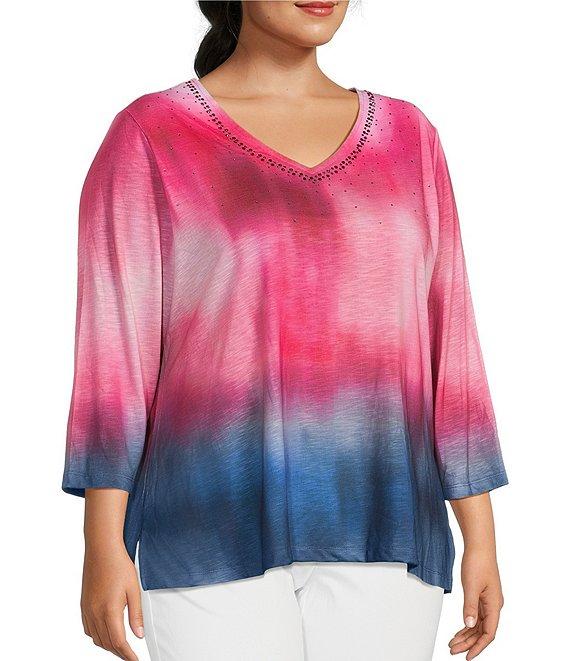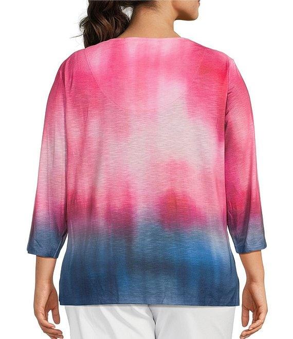Allison Daley Plus Size Ombre Beauty Print 3/4 Sleeve V-Neck Slub Jersey Knit Top