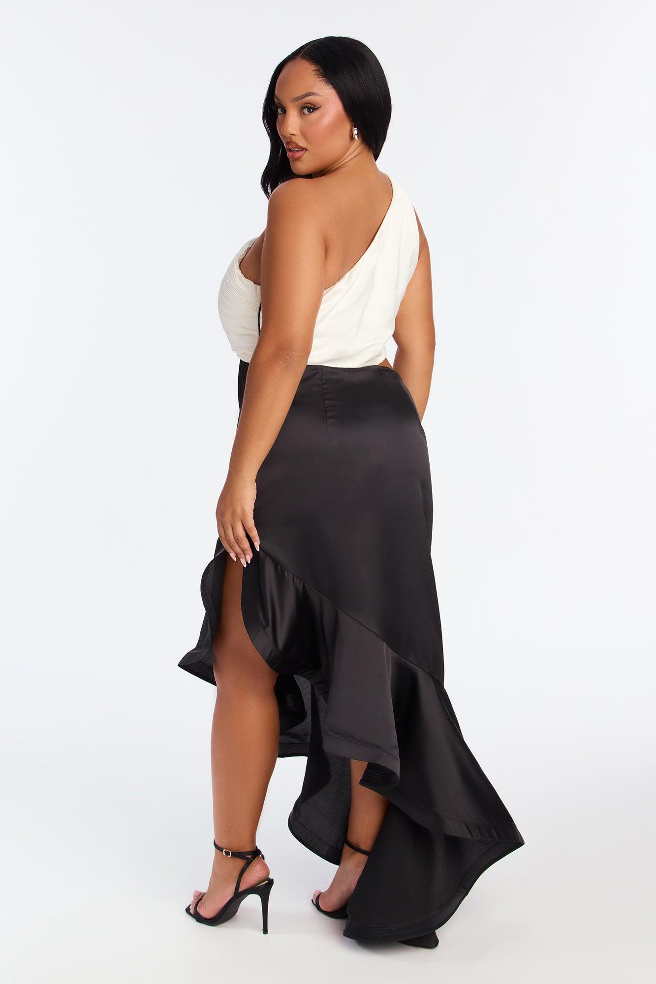 Available In Black/White. Satin Gown Sleeveless One Shoulder Neckline Grip Tape Pleated Side Cut Out Ruffle Detail Slit Hidden Side Zipper Lined Non Stretch Self : 100% Polyester Lining : 100% Polyester Imported