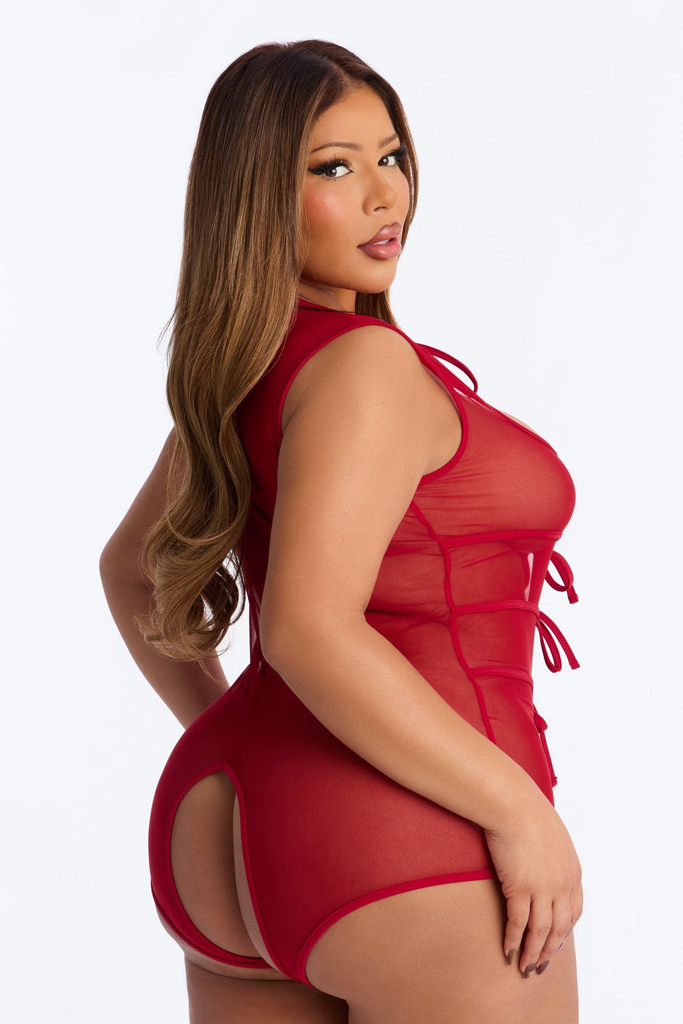 Available In Burgundy. Crotchless Romper Sheer Sleeveless Adjustable Front Ties Back Zipper Closure Cheeky Stretch Final Sale Self : 92% Polyester 8% Spandex Imported California Proposition 65WARNING: Cancer and Reproductive Harm - www.P65Warnings.ca.gov.