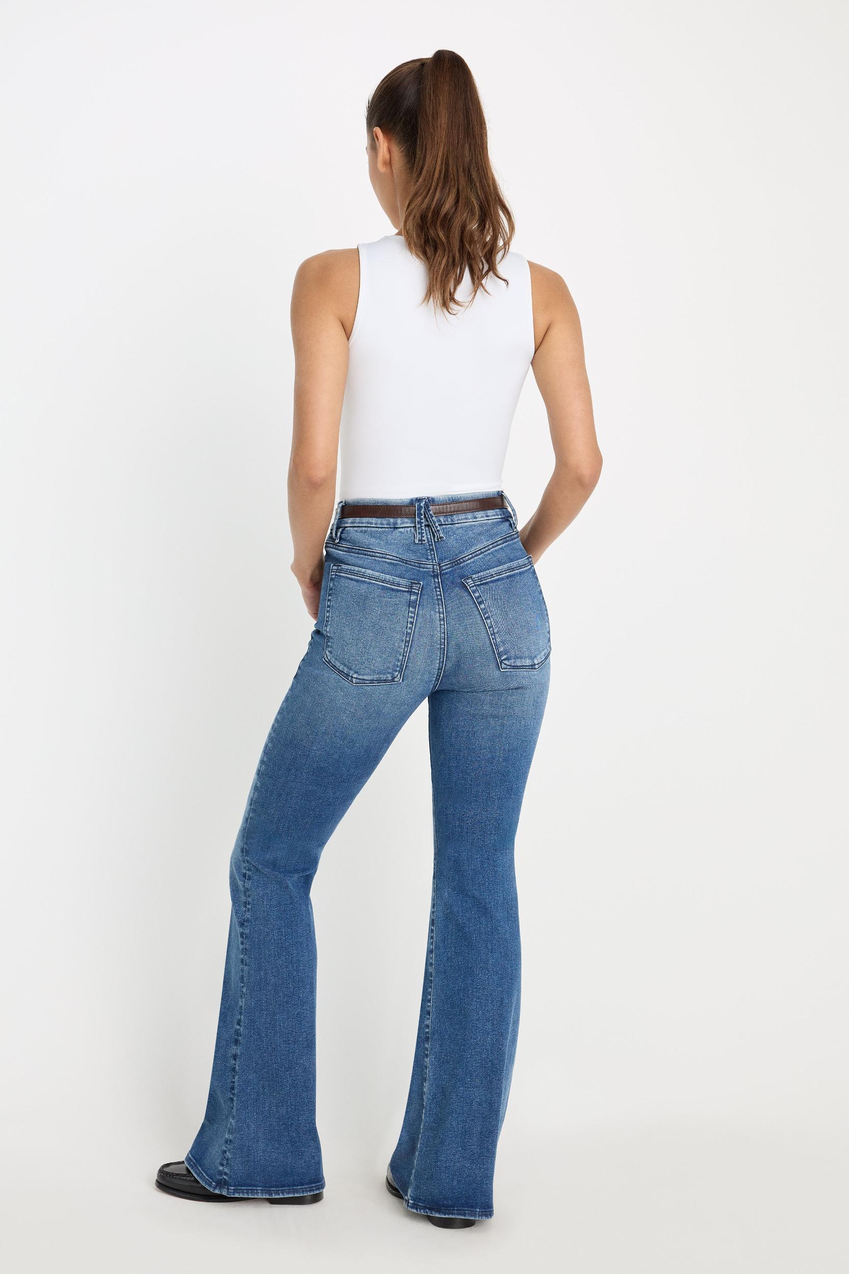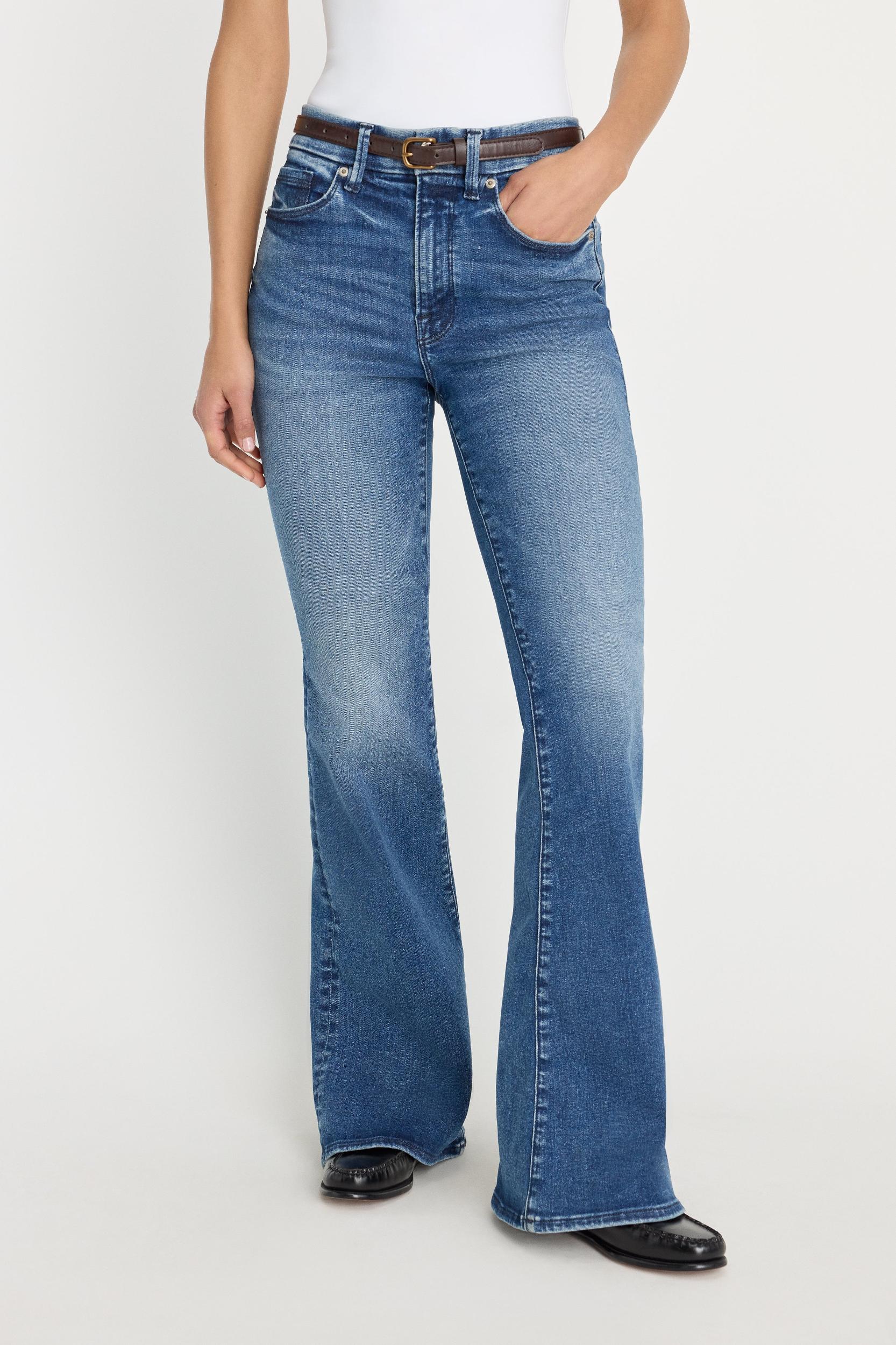 The ultimate sculpting jeans, featuring stylish flared legs. Good Legs are the body-hugging, booty shaping jeans of your dreams. A versatile and stylish pair of 5-pocket jeans, designed skinny through the hip and thigh with a curve-hugging silhouette that finishes with a flared hem. Featuring a flattering mid-rise waistline, Good Legs are made to accentuate your curves and provide a sleek silhouette that's both timeless and sexy. This pair of jeans is crafted from our most innovative fabric – Always Fits denim is designed to offer unparalleled comfort and style in a groundbreaking one-size-fits-four design with 100% stretch, that ensures optimal flexibility and unrestricted movement. Effortlessly adapting to your body’s changes, Good Legs Flare Jeans offer unbeatable stretch that molds to your body, hugging your curves and accentuating your best features. Mid-rise Flared legs Clean hem with grinding Always Fits Denim 100% stretchability Classic 5-pockets Front zip-fly closure Gap-proof waistband Reinforced belt loops Tummy smoothing technology Dark blue wash Inseam: 33.5" Fabric: 81.5% Cotton, 5% Recycled Cotton, 4.5% Elasterl-P, 5% Recycled Polyester, 4% Elastane Care: Wash inside out in cold water with like colors. Do not bleach. Tumble dry on low. Iron on medium heat. Do not dry clean.