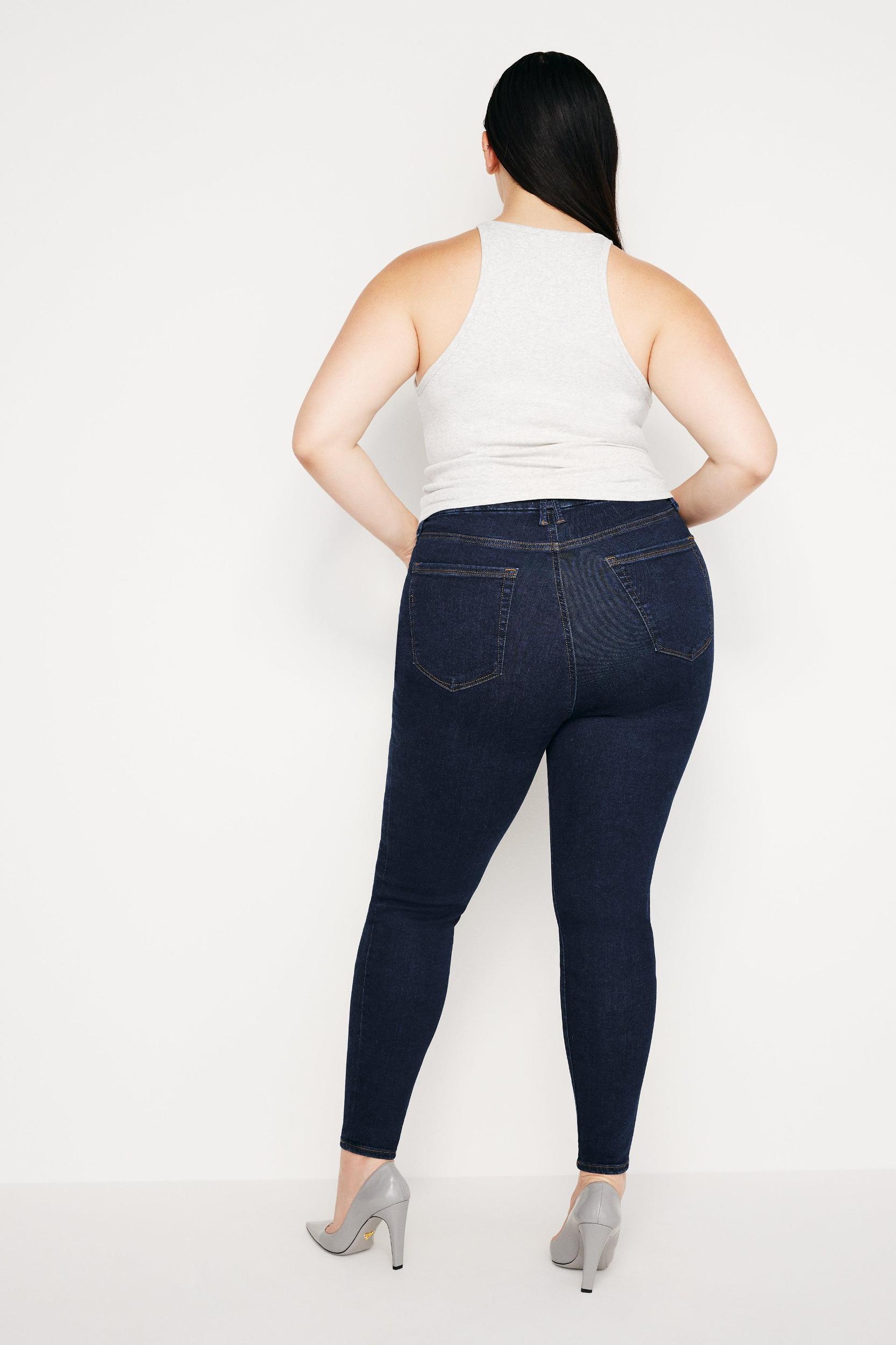 Our most innovative jean EVER. Always Fits from Good American features a one-size-fits-four design that adapts to your body’s changes, guaranteeing the perfect fit every time. Bye bye, traditional sizing. Now available in our Good Legs fit. Mid-rise Skinny legs Classic 5-pockets Front zip-fly closure Gap-proof waistband Reinforced belt loops Tummy smoothing technology Clean details and hem Dark blue wash Inseam: Regular 29" | Long 35" Fabric: 81.5% Cotton, 5% Recycled Cotton, 5% Recycled Polyester, 4.5% Elasterel-P, 4% Elastane Care: Machine wash cold, inside out. Dry flat or hang dry. For more info, please see our denim care guide. Model size 0 is 5'9 and wearing size 00-4 Model size 16 is 5'11 and wearing size 14-18