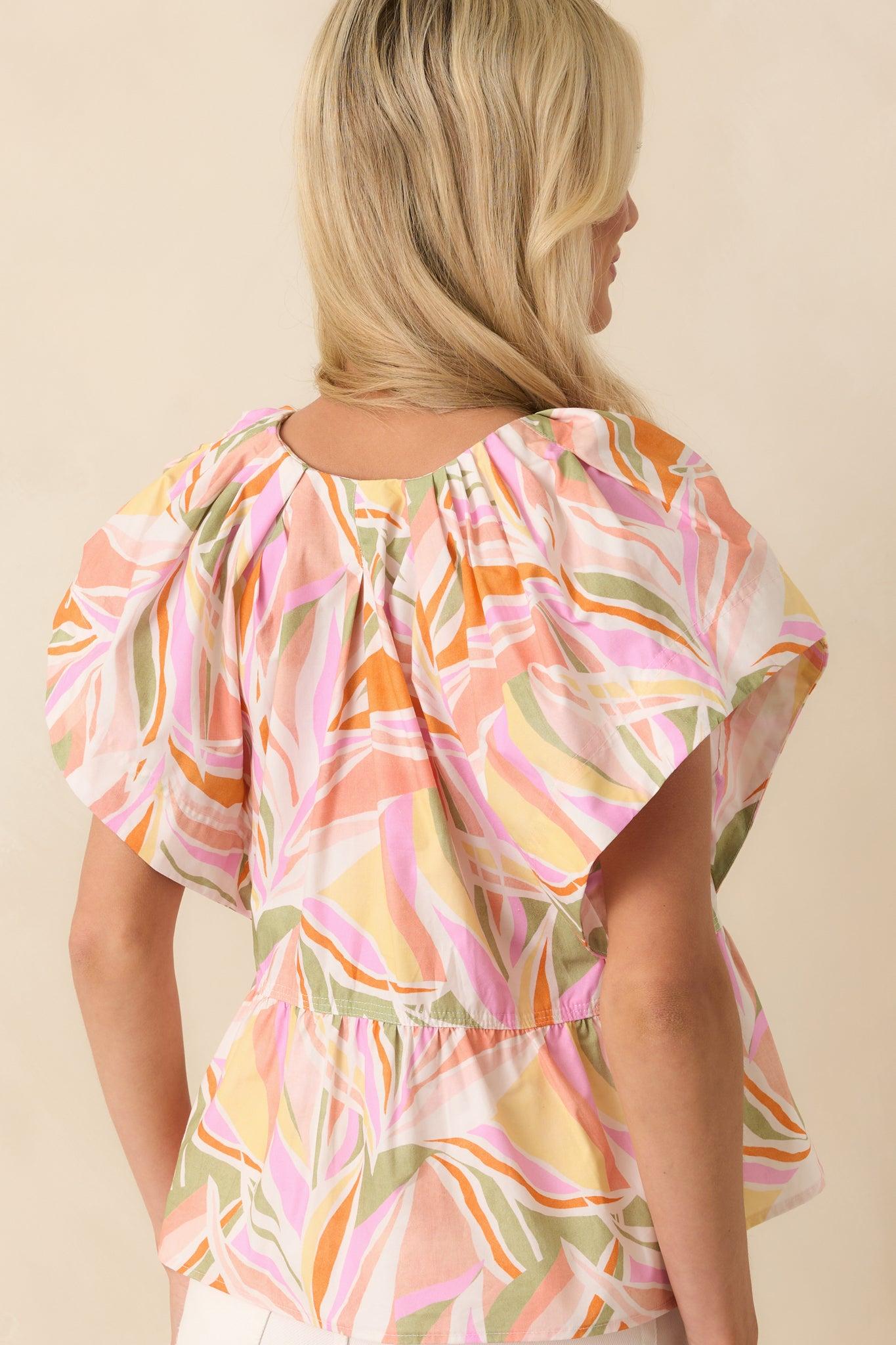 Always Knew Light Pink Abstract Floral Print Cotton Peplum Top is the kind of piece that speaks for itself. Instantly flattering and quietly refined, it’s the choice you make without hesitation and never second guess. This light pink top features a multicolor abstract floral print, v-neckline, panel design, short ruffle butterfly sleeves, white topstitch detailing throughout, and a peplum silhouette.
