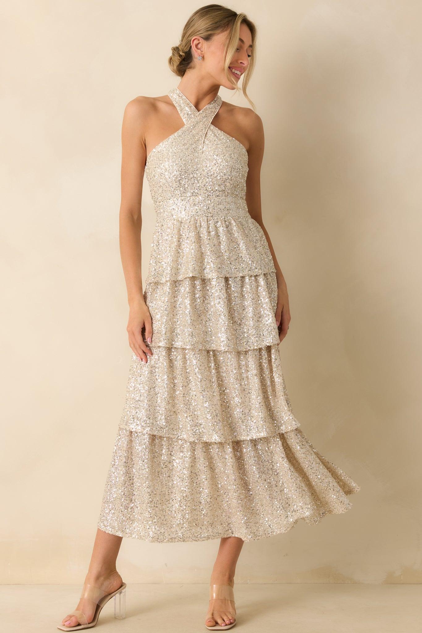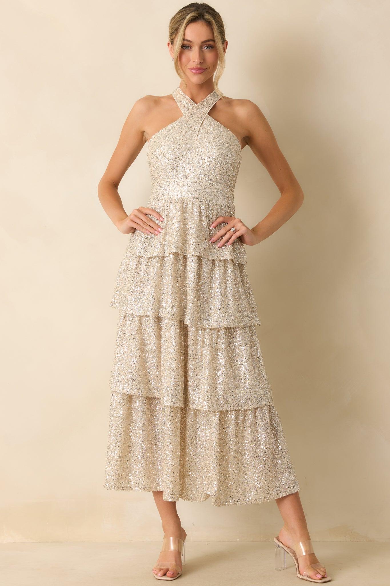 Step into the spotlight with the Always On Point Champagne Sequin Halter Maxi Dress. Designed to shimmer with every move, this elegant gown blends timeless grace with modern glamour — perfect for celebrations, or any night that calls for a little sparkle. This champagne sequin maxi dress features a halter neckline with a button closure at the back of the neck, a back zipper, a tiered skirt, and a fully lined interior for comfortable wear. 95% Polyester & 5% Spandex Lining: 100% Polyester Hand Wash Cold Manufactured in China Designed in the USA Model is 5'8" and wearing size small, clipped, model is a true x-small